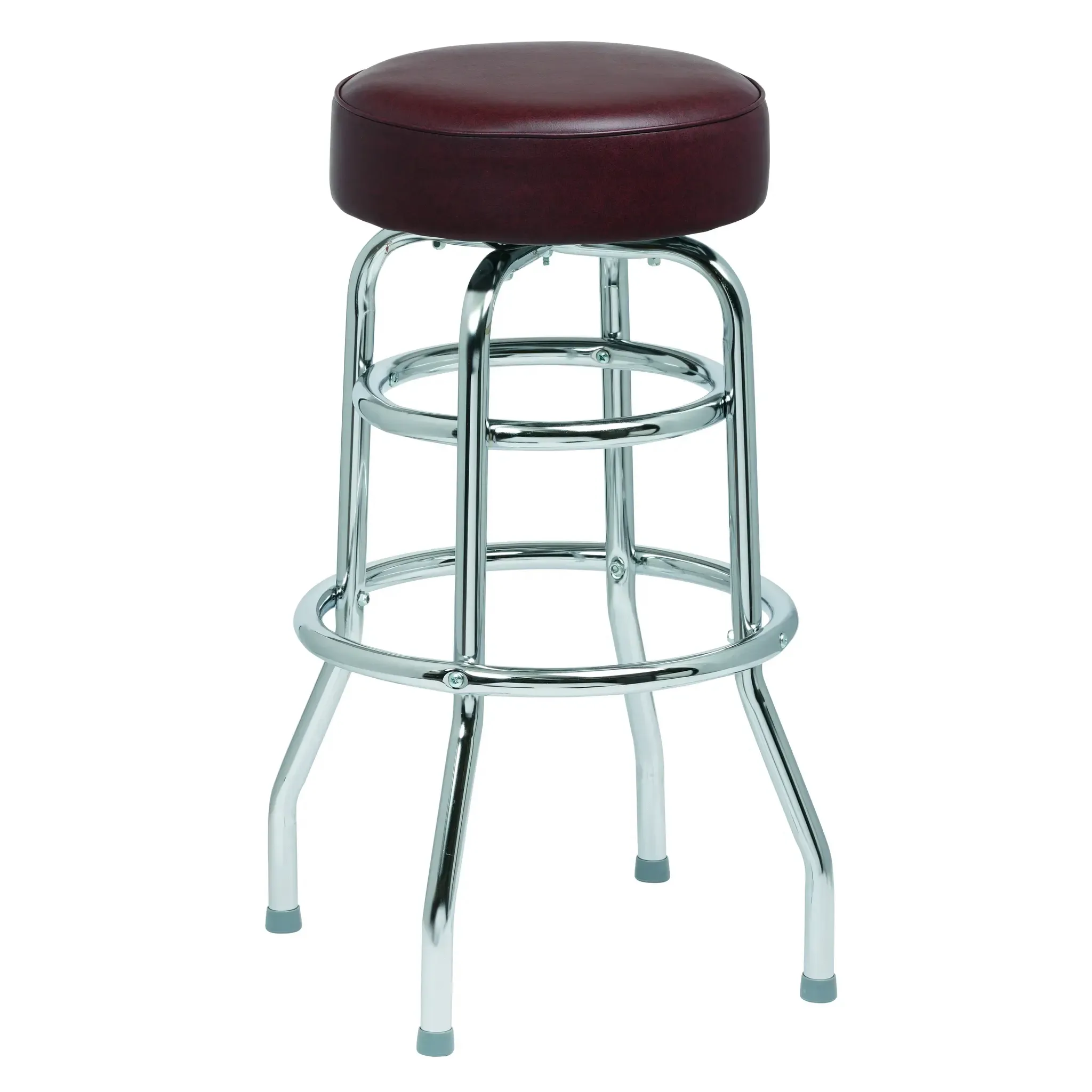 Improve functionality with the Royal Industries, ROY 7712 BRN Bar Stool. Designed for commercial restaurant use, this swivel bar stool enhances your establishment's seating options. The 30" height and backless design make it easy for customers to sit comfortably at the bar or high-top tables. The 4" thick tailored seat with single sewn welt and 1" thick padding provide exceptional comfort, ensuring guests can relax while enjoying their meals or drinks. The ball bearing swivel allows for smooth and effortless rotation, while the double ring base provides stability and durability. The chrome frame adds a sleek and modern touch to any restaurant decor. Made with heavy-duty brown vinyl, this bar stool is easy to clean and maintain. With its high-quality construction and stylish design, the Royal Industries Bar Stool is a must-have for any commercial restaurant looking to enhance its seating options.