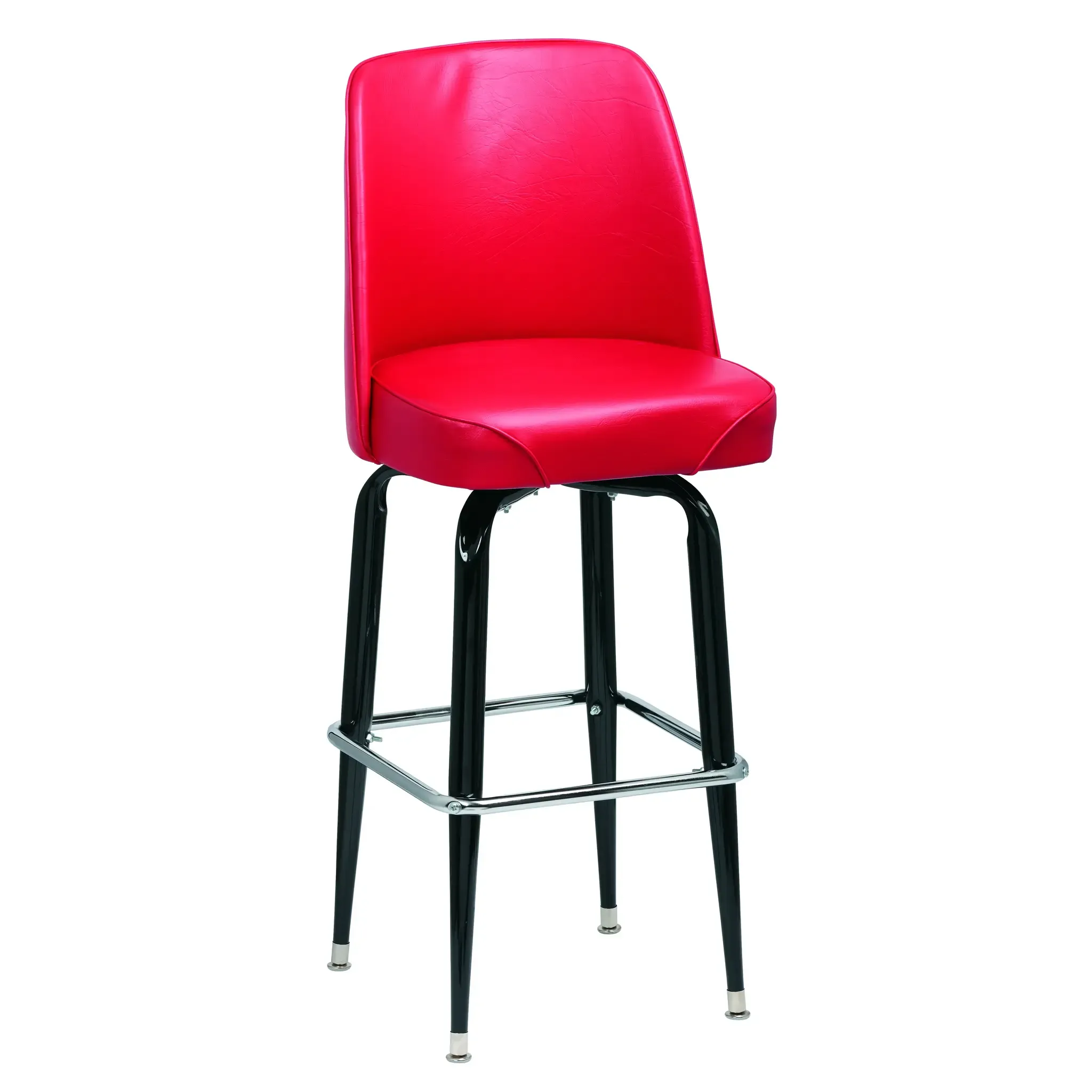 Upgrade operations with the Royal Industries, ROY 7714 R, Bar Stool, Swivel, Indoor. This high-back bucket bar stool is designed to enhance comfort and style in any commercial restaurant setting. The foam-padded waterfall seat provides exceptional support, allowing customers to sit back and relax while enjoying their meals. The 3 ball bearing swivel ensures smooth and effortless movement, allowing guests to easily turn and engage in conversations. With a single chrome ring and chrome glides with a nylon base, this bar stool is not only durable but also easy to clean and maintain. The square black frame adds a touch of elegance to any decor, while the vibrant red vinyl upholstery adds a pop of color. Sold by the case, with a minimum order of 2 each, this bar stool is perfect for restaurants looking to upgrade their seating options. Enhance your restaurant's ambiance and comfort with the Royal Industries, ROY 7714 R, Bar Stool, Swivel, Indoor.