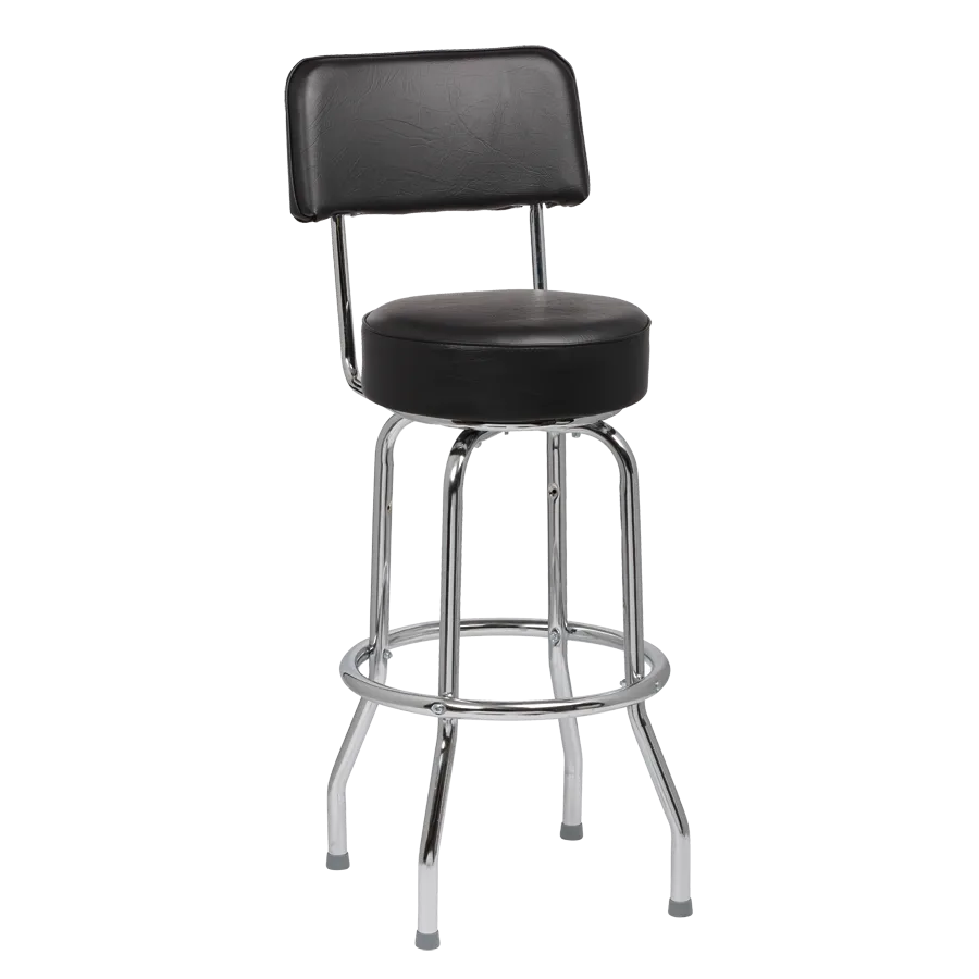 Improve functionality with the Royal Industries, ROY 7715 B, Bar Stool, Swivel, Indoor. This swivel bar stool is designed to enhance the dining experience in commercial restaurants. With its upholstered back and seat, it offers both comfort and style. The open back design adds a modern touch, while the 4-1/4" thick round seat with single welt provides extra cushioning. The ball bearing swivel allows for easy movement, making it convenient for customers to sit and socialize. The single chrome ring base ensures stability, while the heavy-duty black vinyl upholstery is durable and easy to clean. The plastic glides protect the floor from scratches and scuffs. Sold by the case, with a minimum order of 2 each, this bar stool is a great addition to any restaurant setting. Please note that this product contains Bisphenol A (BPA), which may cause reproductive harm. For more information, visit www.P65Warnings.ca.gov.
