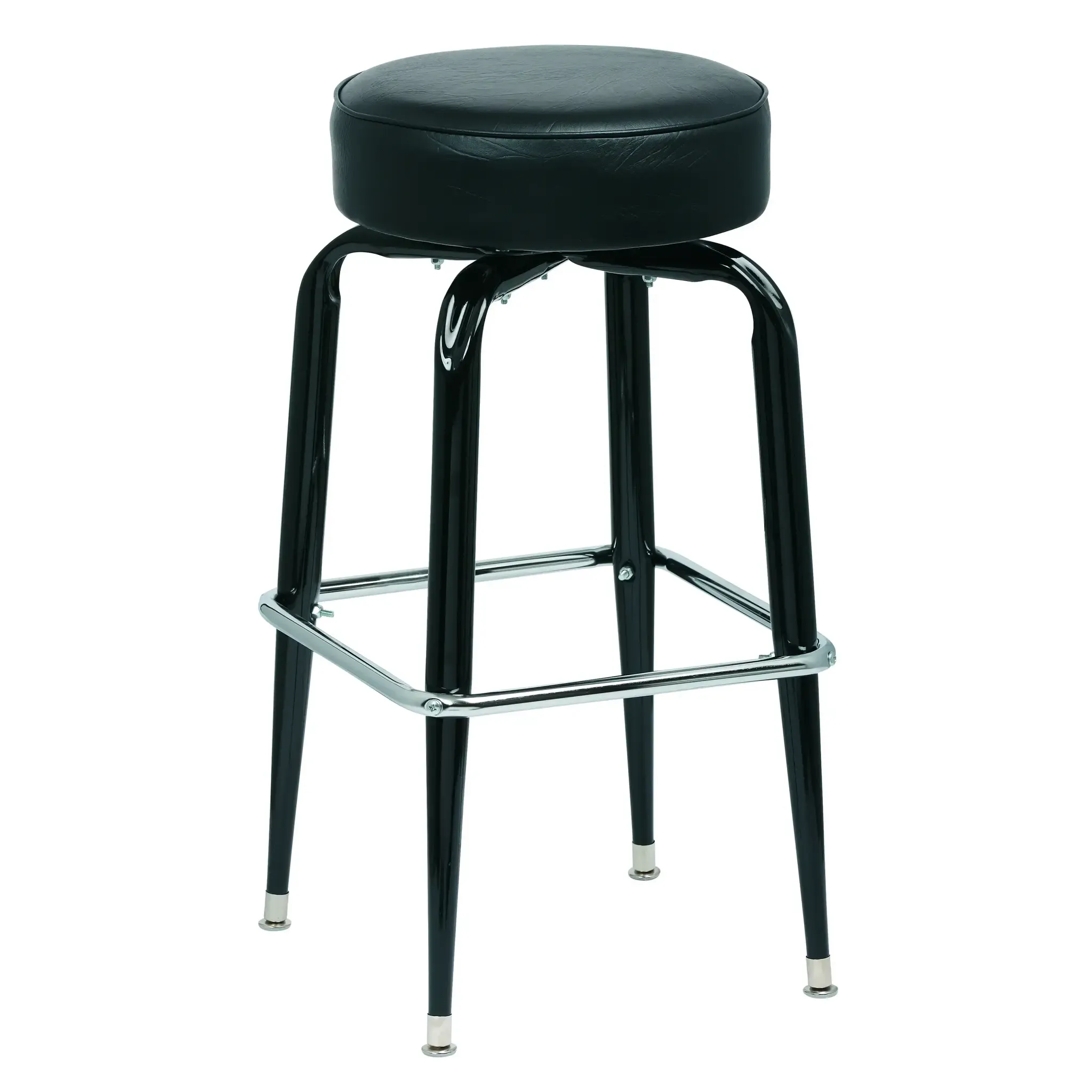 Optimize performance with the Royal Industries, ROY 7723 B Bar Stool. Designed for commercial restaurant use, this swivel bar stool is a perfect addition to any indoor dining space. With a square black frame and a single chrome ring, this stool offers both durability and style. The 14" diameter standard seat features a 4" thick tailored seat with a single sewn welt, providing comfort for your guests. The 1" thick padding ensures long-lasting support, while the ball bearing swivel allows for easy movement. The heavy-duty fabric back in black vinyl adds a touch of elegance to the stool. Additionally, the chrome glides with a nylon base prevent scratches on your floors. Sold by the case, with a minimum order of 4 stools, this bar stool is a must-have for any restaurant looking to enhance its seating options.