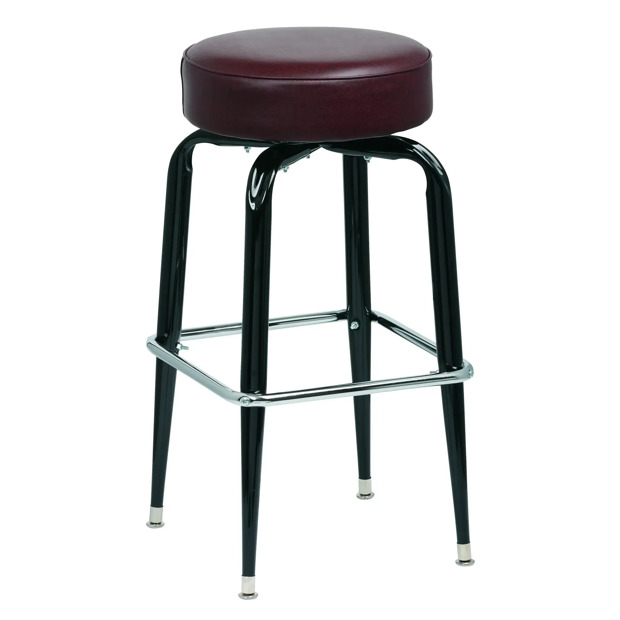 Enhance overall performance with the Royal Industries, ROY 7723 BRN Bar Stool. Designed for commercial restaurant use, this swivel bar stool combines comfort and durability to elevate your dining experience. The 4" thick tailored seat with a single sewn welt provides exceptional comfort, while the 1" thick padding ensures long-lasting support. The ball bearing swivel allows for easy movement, making it convenient for busy restaurant environments. The square black frame and chrome accents add a touch of sophistication to any establishment. With a heavy-duty fabric back in brown vinyl, this bar stool is not only stylish but also easy to clean and maintain. The chrome glides with a nylon base ensure stability and prevent floor damage. Sold by the case, with a minimum order of 4 each, this bar stool is a must-have for any commercial restaurant looking to enhance its seating options.