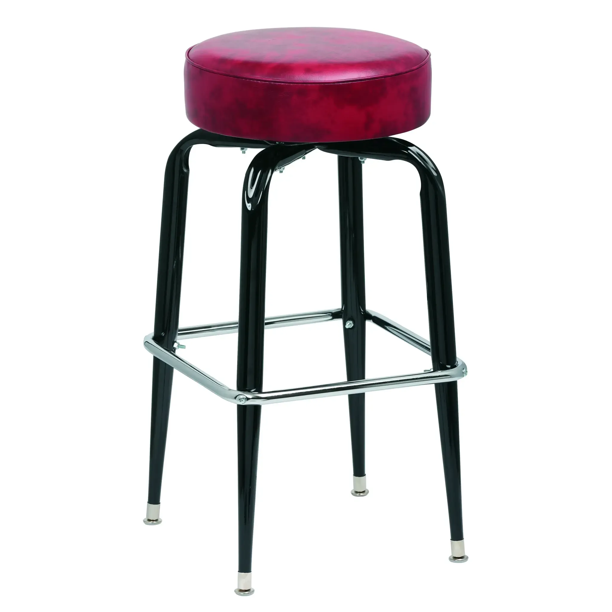 Enhance functionality with the Royal Industries, ROY 7723 CRM Bar Stool. Designed for commercial restaurant use, this bar stool combines comfort and durability to elevate your dining experience. The 4" thick tailored seat with a single sewn welt provides optimal support, while the 1" thick padding ensures lasting comfort. The ball bearing swivel allows for easy movement, making it convenient for customers to socialize at the bar or enjoy their meals. The square black frame and chrome accents add a touch of sophistication to any restaurant decor. With a heavy-duty fabric back in crimson vinyl, this bar stool is not only stylish but also easy to clean and maintain. The chrome glides with a nylon base ensure stability and prevent floor damage. Sold by the case, this bar stool is a must-have addition to any commercial restaurant.