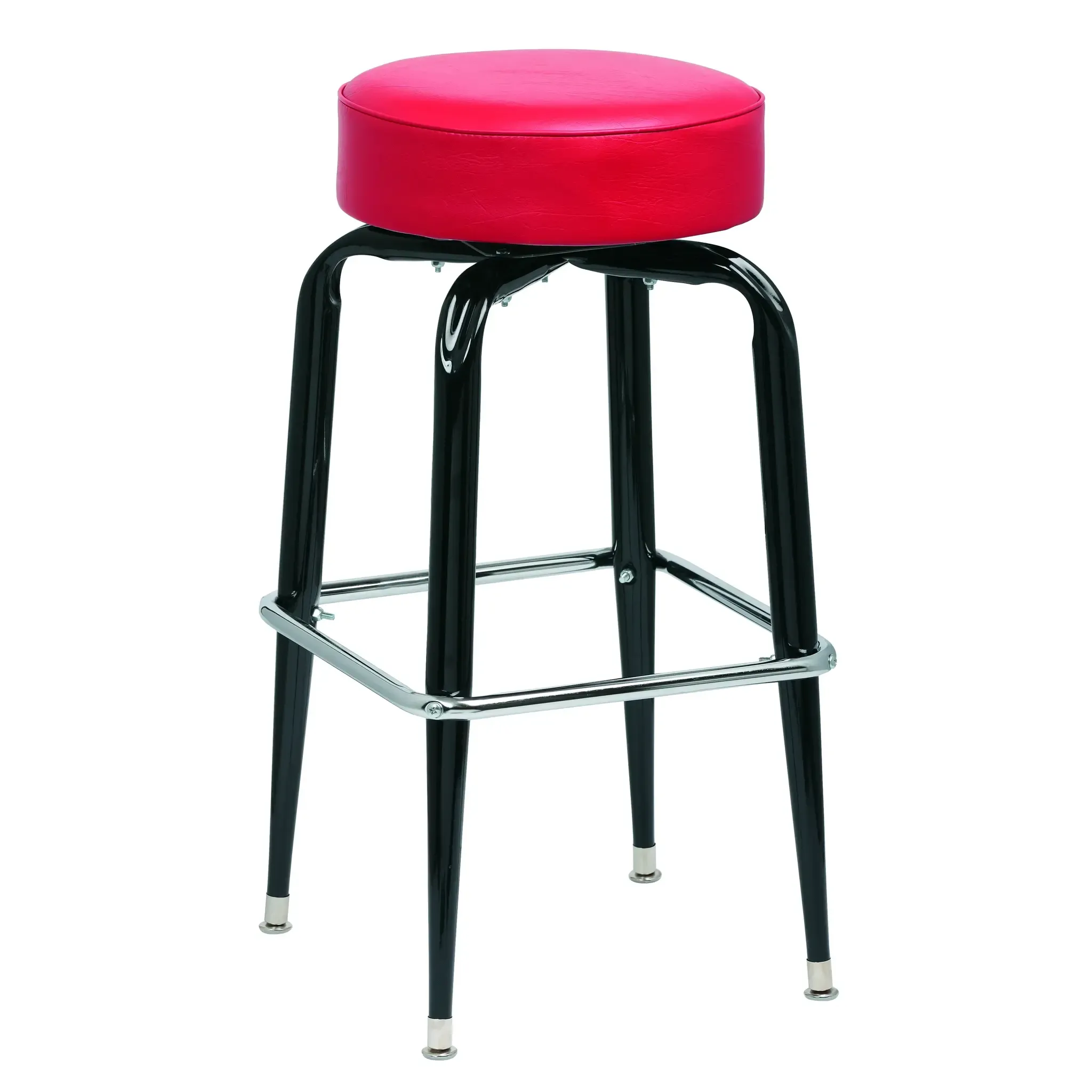 Enhance efficiency with the Royal Industries, ROY 7723 R Bar Stool. Designed for commercial restaurant use, this swivel bar stool offers both comfort and durability. The 4" thick tailored seat with a single sewn welt provides a plush seating experience, while the 1" thick padding ensures long-lasting comfort. The ball bearing swivel allows for easy movement, making it convenient for busy restaurant environments. The square black frame and chrome accents give this bar stool a sleek and modern look that will complement any restaurant decor. Additionally, the heavy-duty fabric back in red vinyl adds a touch of elegance. With its chrome glides and nylon base, this bar stool is built to withstand heavy use. Sold by the case, with a minimum order of 4 each, this bar stool is a must-have for any commercial restaurant looking to enhance its seating options.