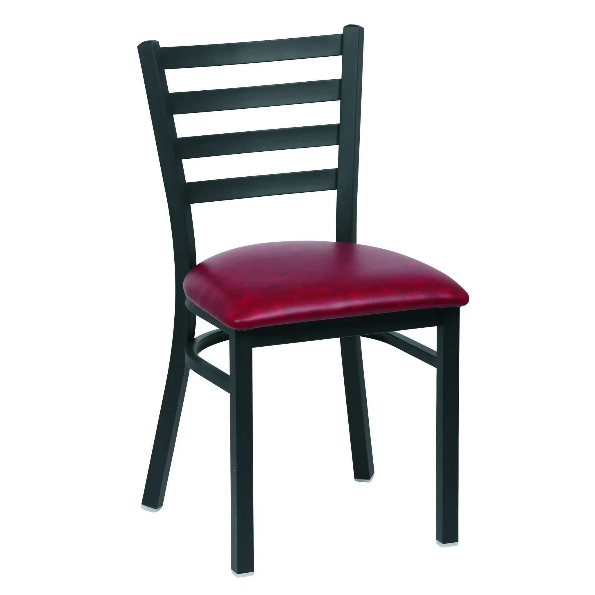 Improve functionality with the Royal Industries, ROY 9001 CRM Chair. Designed specifically for commercial restaurant use, this side chair combines comfort and durability to enhance the dining experience for your customers. The ladder back design provides excellent support, while the upholstered crimson vinyl cushion seat adds a touch of elegance. The metal frame with a matte black finish ensures long-lasting performance, and the nylon foot prevents scratches on your floors. With a compact size of 17"L x 16-1/2"W x 33-1/2"H, this chair is perfect for maximizing seating capacity in your restaurant. Sold by the case, with 2 chairs per case, this product offers great value for your money. Trust Royal Industries to deliver high-quality furniture that meets the demands of a busy restaurant environment.