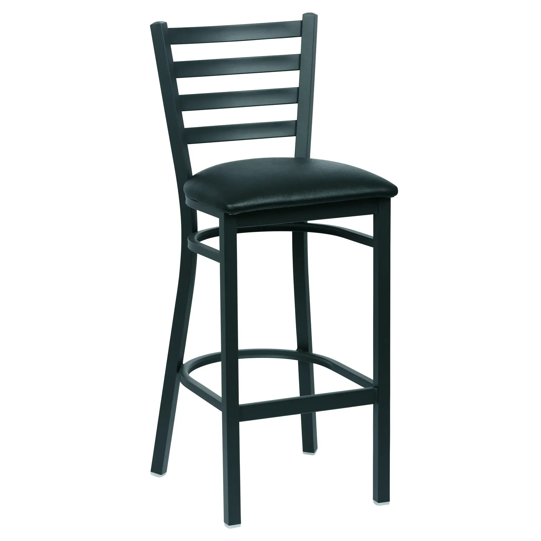Improve dynamics with the Royal Industries, ROY 9002 BLK, Bar Stool, Indoor. This sleek and stylish bar stool is designed to enhance the ambiance of any commercial restaurant setting. With its ladder back design and matte black finish, it adds a touch of sophistication to your establishment. The upholstered black vinyl cushion seat provides comfort for your customers, while the metal frame and nylon foot ensure durability and stability. The bar stool is packed by Royal Industries, a trusted name in the industry, and meets all safety standards. It comes in a case pack of 1, making it easy to order and stock. Whether you're running a bar, pub, or restaurant, this bar stool is a must-have for creating a comfortable and inviting atmosphere for your patrons.