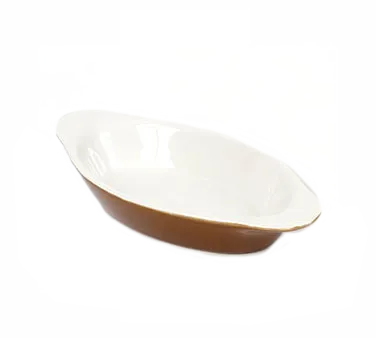 Improve dynamics with the Royal Industries, ROY R 8 WB 3 Rarebit China. This rarebit dish is designed to enhance your restaurant's dining experience. With a capacity of 8 oz., it is perfect for serving delicious and visually appealing dishes. The oval shape adds a touch of elegance to your presentation, while the carmel/white color combination complements any table setting. Made from high-quality china, this rarebit dish is durable and long-lasting, making it ideal for commercial restaurant use. It is packed by Royal Industries, a trusted name in the industry, ensuring its authenticity and reliability. Additionally, this rarebit dish is sold in a case of 2 dozen, providing you with an ample supply for your restaurant's needs. Elevate your culinary creations with the Royal Industries, ROY R 8 WB 3 Rarebit China.