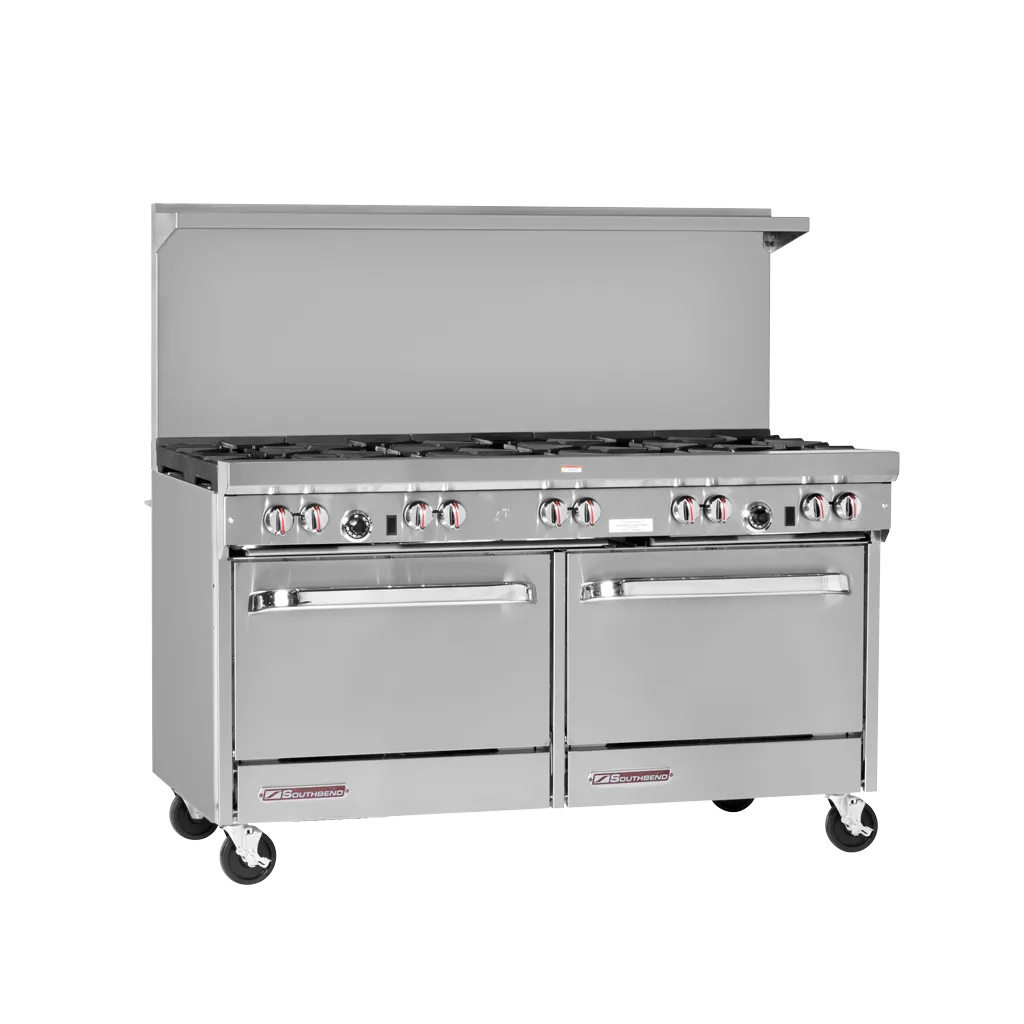 Elevate your culinary experience with the Southbend S60DD Range, a top-of-the-line gas restaurant range designed to meet the demands of a busy commercial kitchen. With its 60" size and 10 powerful 28,000 BTU open burners, this range provides ample cooking space and precise heat control for preparing multiple dishes simultaneously. The two standard ovens feature a snap action thermostat and come with a removable cast iron grate, crumb drawer, and shelf for easy cleaning and organization. Each oven also includes one rack, allowing you to bake or roast with ease. Made with a stainless steel front, sides, shelf, and 4" front rail, this range is not only durable but also adds a sleek and professional look to your kitchen. With 6" adjustable legs, you can easily customize the height to fit your needs. CSA and NSF certified, the Southbend S60DD Range delivers exceptional performance and reliability, making it the perfect choice for any commercial restaurant.