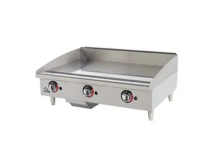 Star-Max®manual gas griddles are a perfect match for the budget minded operator. For breakfast, lunch or dinner, the Star-Max manual control griddles out-perform the competition. Star-Max® griddles feature 1” thick polished steel griddle plate and are available in 15”, 24” 36” and 48” widths. 28,300 BTU aluminized burner every 12” of width controlled by a modulating thermostatic, 3/4” N.P.T. male gas connection with convertible pressure regulator, and 4” adjustable legs. Griddles operate on Natural or Propane gas.