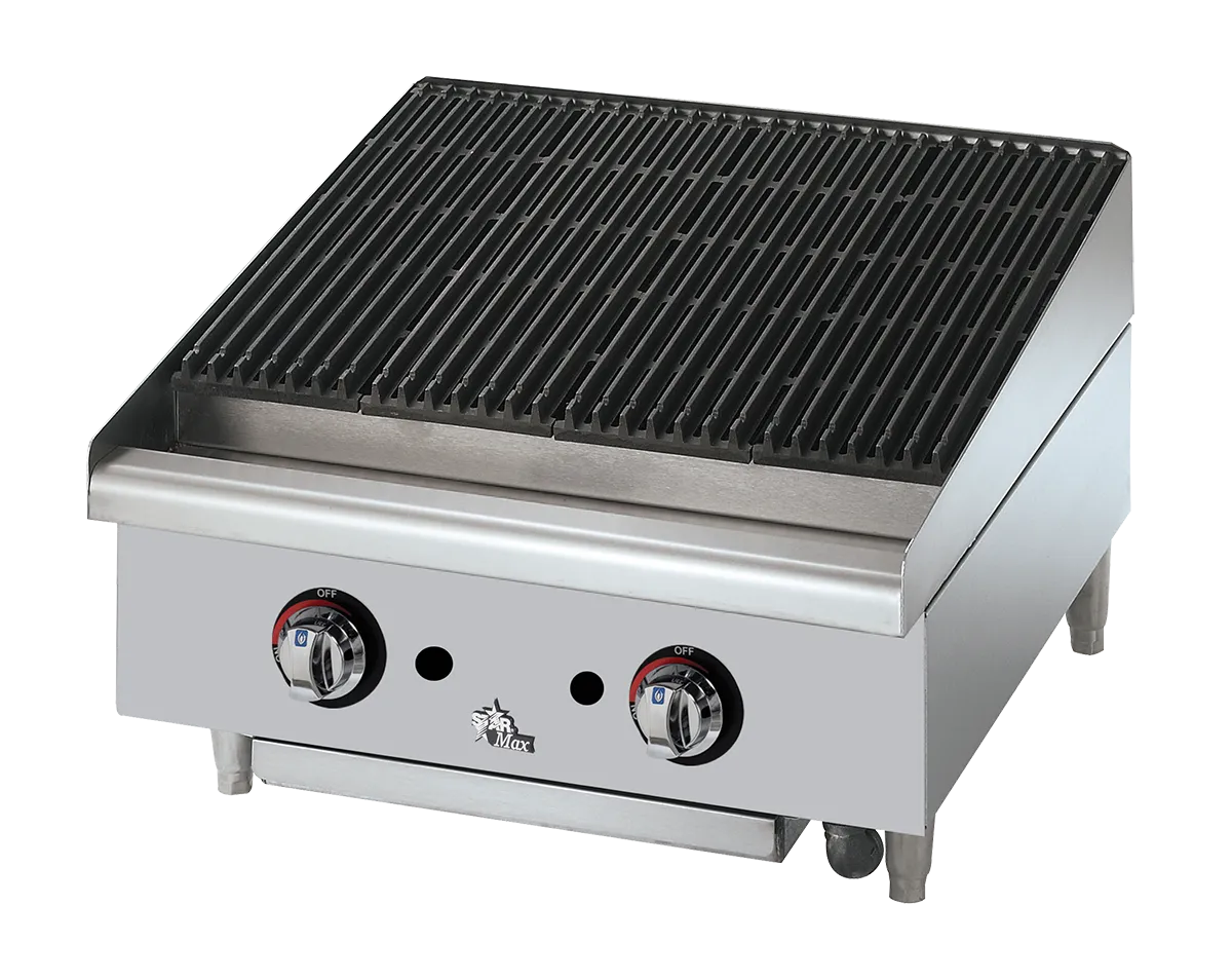 Star-Max radiant and lava rock charbroilers are designed to provide excellent heating and control when preparing a wide variety of products. The units are designed with durability and flexibility in mind with cast iron burners and a control knob for each twelve 12 inch section. The grates have been designed to hold a high capacity of product for maximum efficiency under demanding cooking situations.