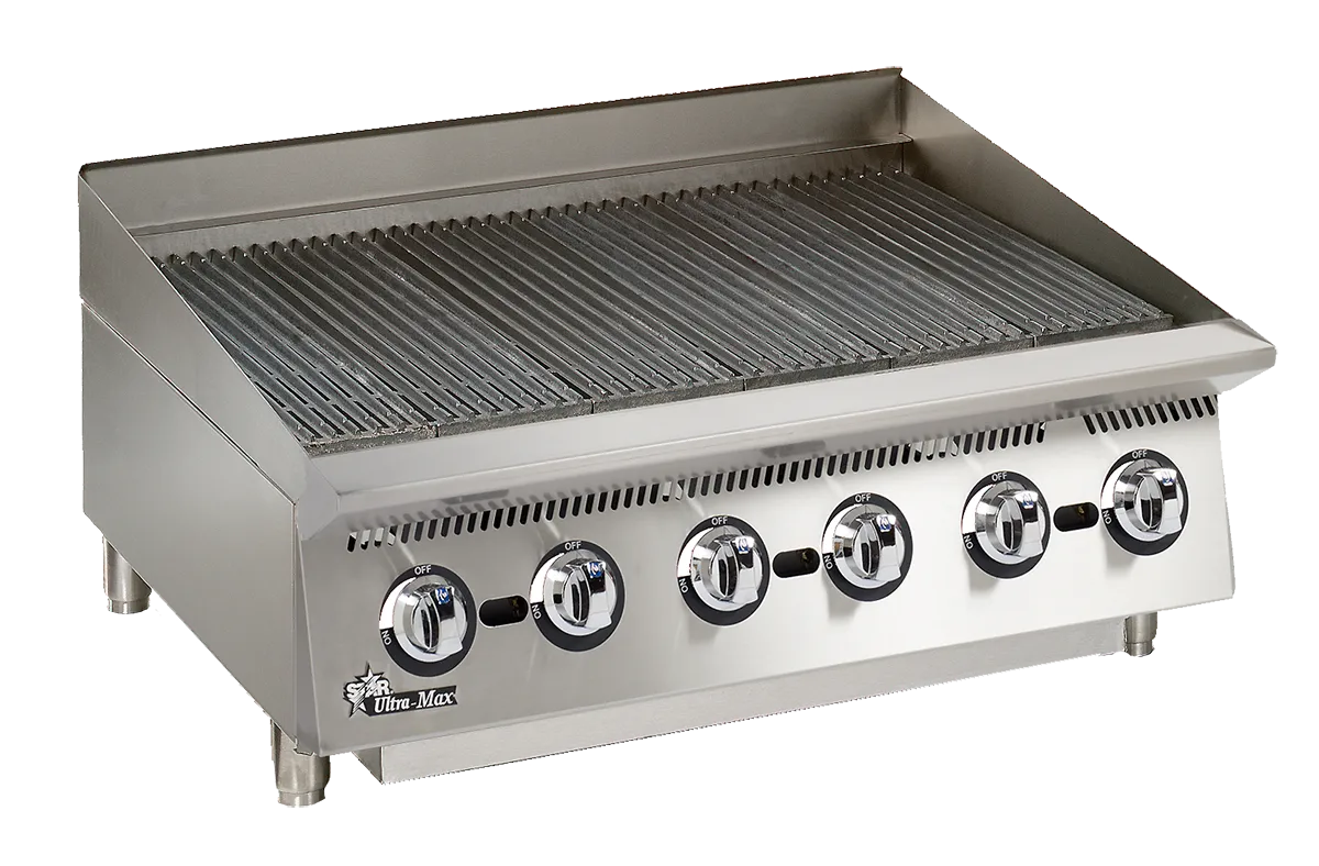 The Ultra-Max® radiant and lava rock charbroilers are constructed in the U.S.A. with a corrosion-resistant stainless steel body. The charbroilers will either use lava rocks or heavy- duty radiants to transfer heat to product. Grates are adjustable per section to be enclined or flat. The units feature cast iron burners which produce 20,000 BTUs per six 6 inches of width and have adjustable valves and a standing pilot. Units will be shipped being set up for Natural Gas, and will include field conversion kit for LP gas. Standard gas connection is 3/4-inch N.P.T. For lava rock models, a five 5 pound bag of lava rocks will be provided for each twelve 12 inches of width.