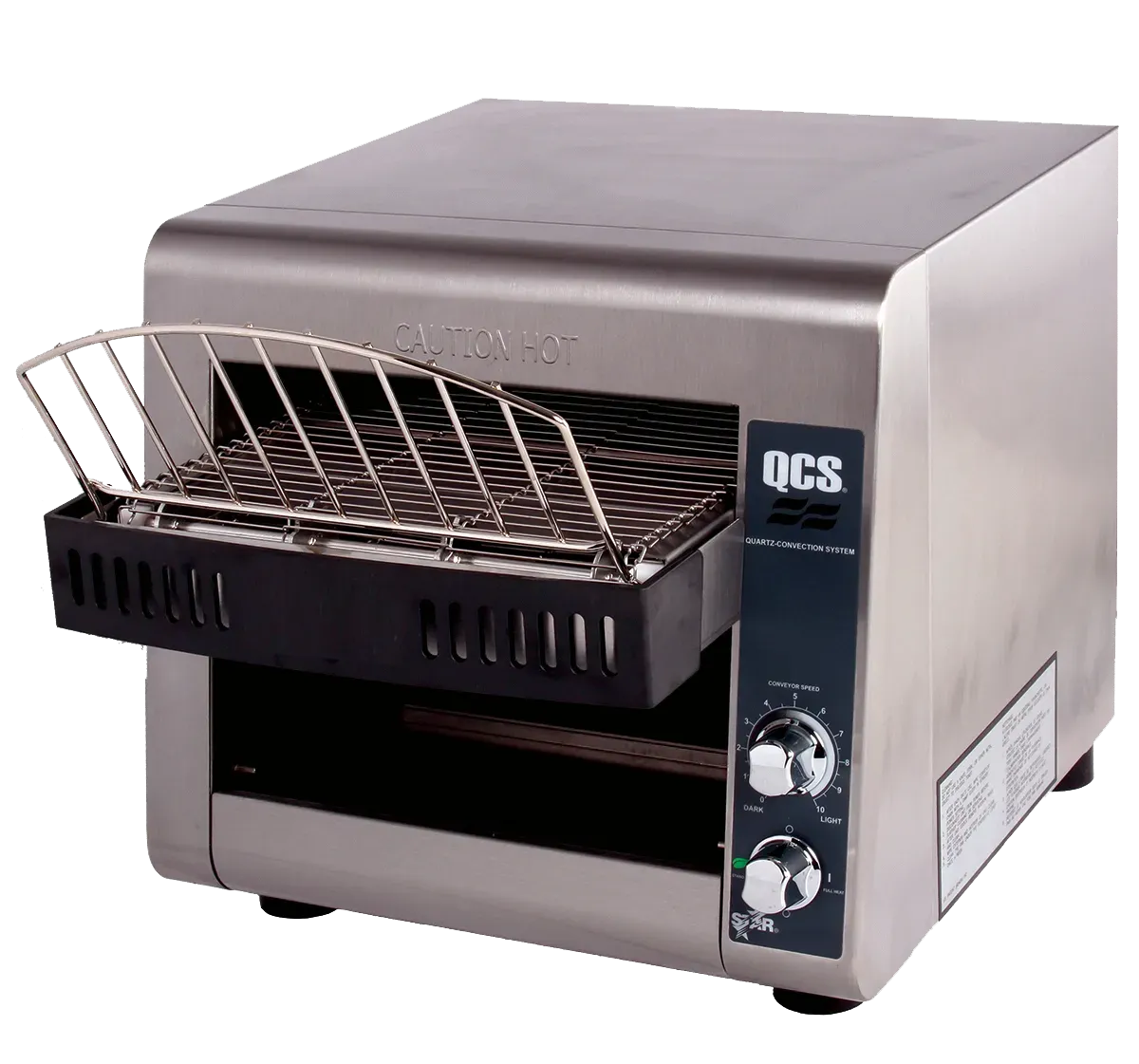 Star QCS1 series conveyor toasters require only 14.25” of counter space and features a product opening height of 1.5”, forced convection system that extends the life of critical components, extended conveyor belt, crumb tray, heated holding area, variable speed control, and a full width burn guard. The heavy-duty motor uses a drive chain for superior reliability.