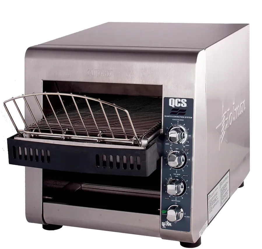 Star’s QCS2-600H conveyor toaster can generate up to 600 slices per hour without taking up too much counter space. The QCS2-600H features analog controls, a 3" product opening, 10" wide variable speed conveyor belt, and independent top and bottom heat controls. Star’s forced convection system keeps the toaster cool-to-the-touch and extends the life of critical components. Stainless steel construction is used for long lasting durability and the heavy-duty motor utilizes a drive chain for superior reliability.