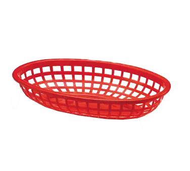 Transform spaces with innovation using TableCraft Products, 1074R, Basket, Fast Food. This classic oval basket is designed to elevate the dining experience in commercial restaurants. Made in the USA with high-quality polyethylene, it is heat resistant up to 150F/65C, making it perfect for use with heat lamps, dishwashers, and microwaves. The vibrant red color adds a pop of excitement to any table setting, while the durable construction ensures long-lasting performance. With a size of 9-3/8" x 6" x 1-7/8", this basket is ideal for serving a variety of fast food items, from burgers and fries to sandwiches and appetizers. Elevate your restaurant's presentation and impress your customers with the TableCraft Products, 1074R, Basket, Fast Food.