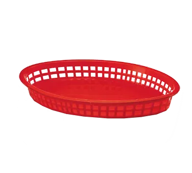 Invest in culinary excellence with TableCraft Products' 1086R Fast Food Basket. Designed for commercial restaurant use, this oval Texas Platter Basket is a must-have for any food establishment. With dimensions of 12-3/4" x 9-1/2" x 1-1/2", it provides ample space for serving a variety of dishes. Made in the USA from heat-resistant polypropylene, this basket can withstand temperatures up to 150F/65C, making it perfect for use with heat lamps, dishwashers, and microwaves. Its vibrant red color adds a pop of excitement to any table setting. Elevate your food presentation and impress your customers with TableCraft Products' 1086R Fast Food Basket. Order now and experience the quality and durability that TableCraft Products is known for.