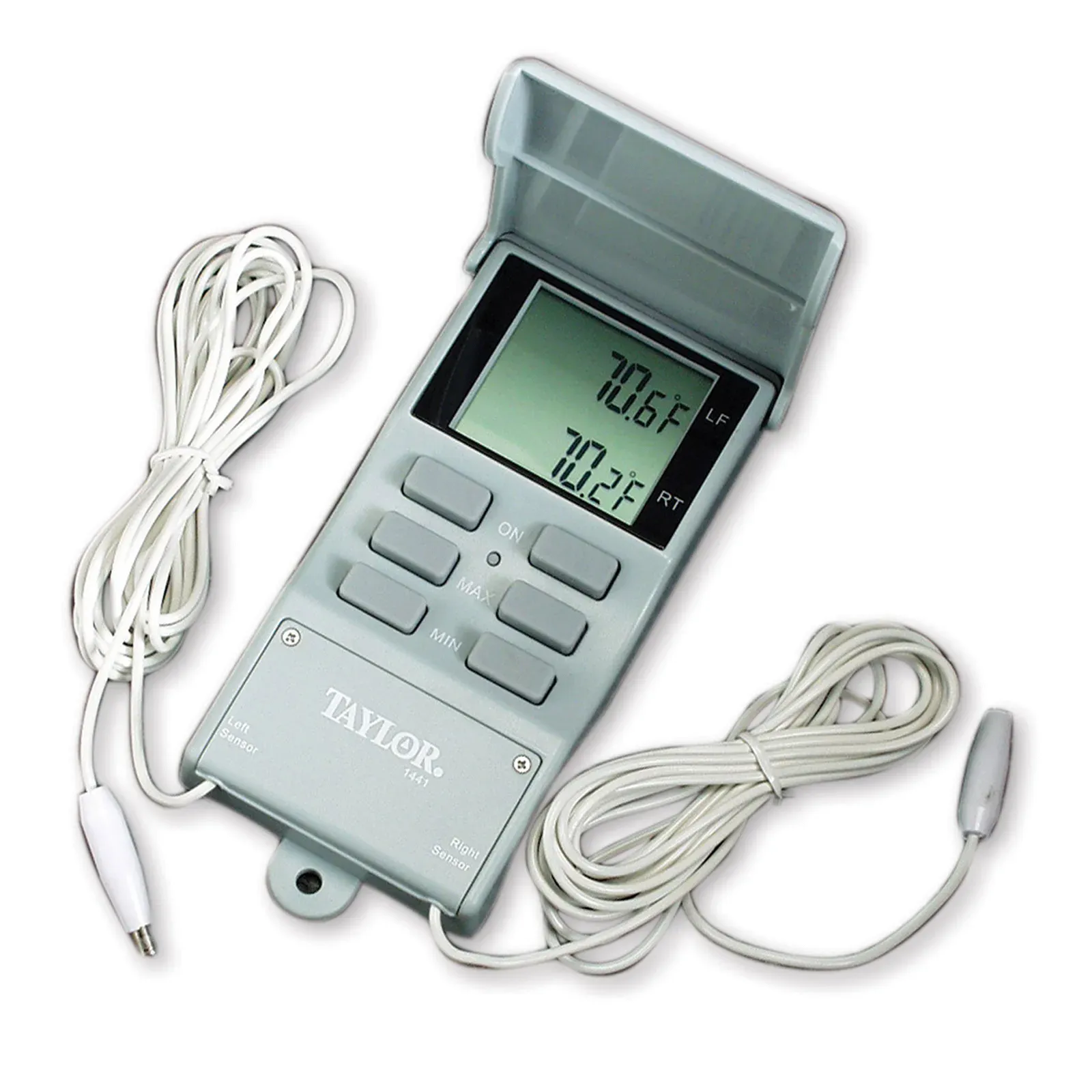 Innovate measurements with the Taylor Precision 1441E Thermometer, Misc. Designed for commercial restaurant use, this digital thermometer is a must-have tool for ensuring food safety and quality. With a temperature range of -20 to 120°F (-29 to 50°C), it allows for accurate monitoring of hot and cold food items. The thermometer features dual 3-meter probes, providing flexibility and convenience in measuring different dishes simultaneously. Its 7-day recording time allows for comprehensive temperature tracking, ensuring compliance with food safety regulations. The Max/Min function allows users to easily monitor temperature fluctuations over time. Trust in the reliability and precision of the Taylor Precision 1441E Thermometer, Misc to maintain the highest standards of food safety in your commercial kitchen.