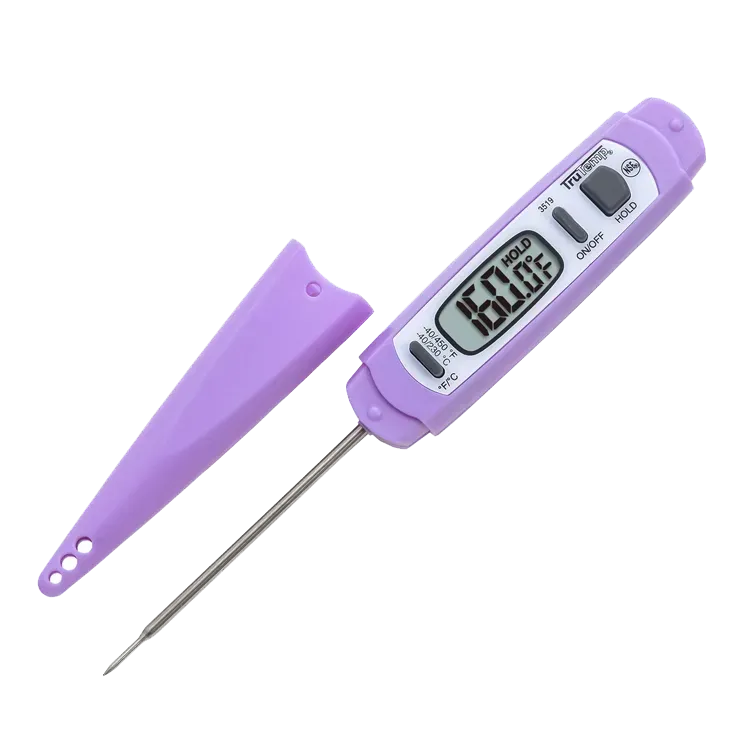 Optimize operations with the Taylor Precision 3519PRFDA Pocket Thermometer. This digital thermometer is designed specifically for commercial restaurant use, ensuring accurate temperature readings from -40°F to 450°F (-40°C to 230°C). The step-down probe, recommended by the FDA, allows for precise measurements, while the 1/2" digital display provides clear visibility. With a waterproof and easy-grip pen-style design, this thermometer is built to withstand the demands of a busy kitchen. The hold and auto-shut off features help conserve battery life, while the included LR44 battery ensures immediate use. Supporting allergy safety, this thermometer is an essential tool for maintaining food quality and preventing cross-contamination. Trust Taylor Precision for reliable and accurate temperature monitoring in your commercial kitchen.