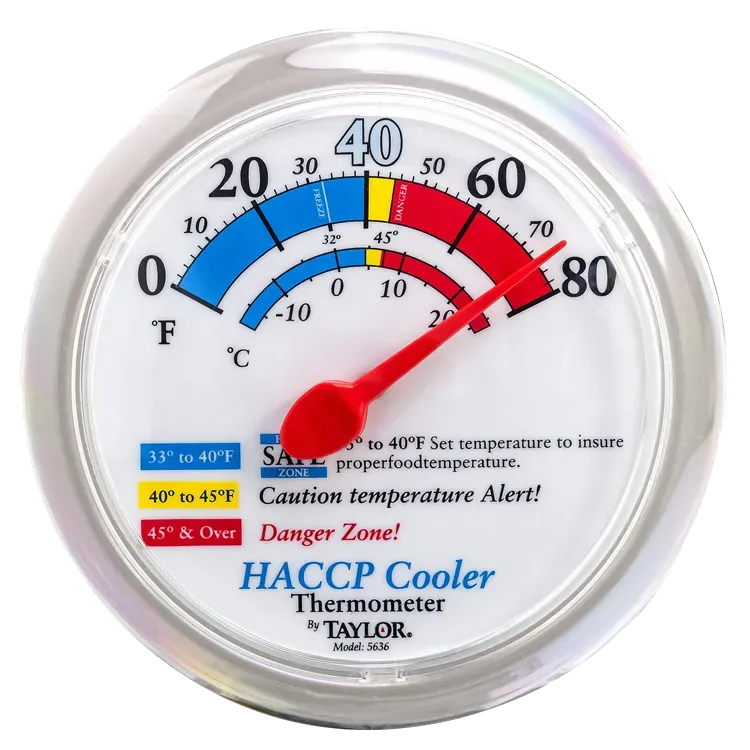 Improve precision with the Taylor Precision, 5636, Thermometer, Time Temp HACCP. This 6" bi-metal thermometer is designed specifically for commercial restaurant use, making it an essential tool for maintaining food safety standards. With a temperature range of 0 to 80F (-17 to 26C), this thermometer ensures accurate readings in cooler and freezer environments. The easy-read numerals and clear bezel allow for quick and effortless temperature monitoring, while the silk-screened graphics and color-coded temperature zones provide visual cues for easy interpretation. The thermometer comes with a convenient wall mount bracket, allowing for easy installation and accessibility. Sold in case quantities of 6 each, this thermometer is a cost-effective solution for outfitting your restaurant kitchen. Trust Taylor Precision, a reputable vendor in the thermometer industry, to provide you with a reliable and durable thermometer that meets HACCP guidelines.