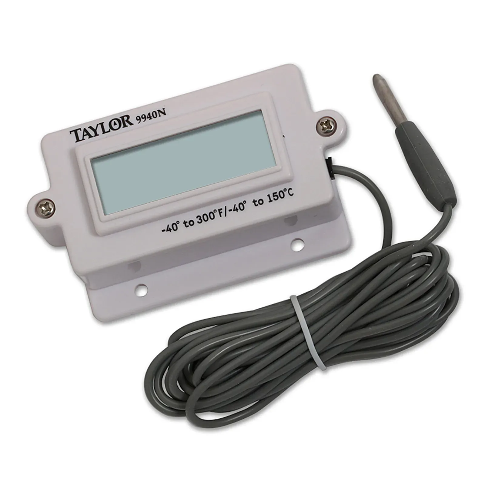 Optimize tools with the Taylor Precision, 9940N, Thermometer, Window Wall. This panel mount digital thermometer is a must-have for any commercial restaurant. With a temperature range of -40° to 300°F (-40° to 150°C), it ensures accurate readings for both air and liquid immersion. The waterproof housing and probe, along with the 10 ft. cable, make it perfect for use in busy kitchen environments. The flush or panel mount design allows for easy installation, while the 10-second update ensures quick and efficient temperature monitoring. Powered by a single AAA battery (included), this thermometer is ready to use right out of the box. Trust Taylor Precision for reliable and durable thermometers that meet the demands of a commercial kitchen.
