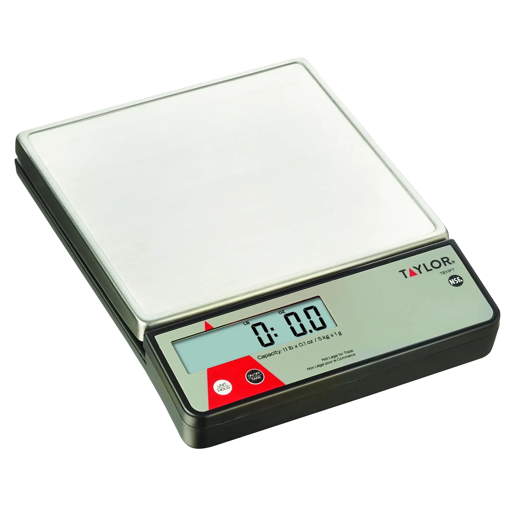 Optimize operations with the Taylor Precision TE11FT Digital Scale. Designed specifically for commercial restaurant use, this 11lb/5kg scale is a reliable and efficient tool for portion control. With its 0.9" LCD display, you can easily read accurate measurements in ounces, grams, or kilograms. The removable stainless steel platform, measuring 7.15" x 7.15" with a marine edge, ensures easy cleaning and durability. The field calibration feature allows for precise measurements, while the tare and hold functions provide convenience and efficiency. The scale also features an auto-off function to conserve battery life, with low battery and overload indicators for added convenience. Made with an ABS plastic base, this scale can be powered by either the included AC adapter or two AAA batteries (not included). NSF certified, this Taylor Precision scale is a must-have for any commercial restaurant looking to streamline their operations.