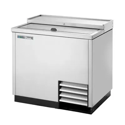 Cook with confidence and flair with the True Manufacturing TD-36-12-S-HC Bottle Cooler. This top-of-the-line bottle cooler is designed to meet the needs of commercial restaurants, ensuring that your beverages are always chilled and ready to serve. With a capacity of 11 cases of 12 oz. bottles or 14.5 cases of 12 oz. cans, this cooler can handle even the busiest of establishments. The stainless steel counter top and lid provide durability and a sleek appearance, while the well design and adjustable bin dividers allow for easy organization and access to your drinks. The LED interior lighting illuminates the cooler, making it easy to find the perfect beverage, and the bottle cap opener and cap catcher add convenience. Made in the USA with high-quality materials, this bottle cooler is built to last. Trust True Manufacturing for all your commercial restaurant needs.