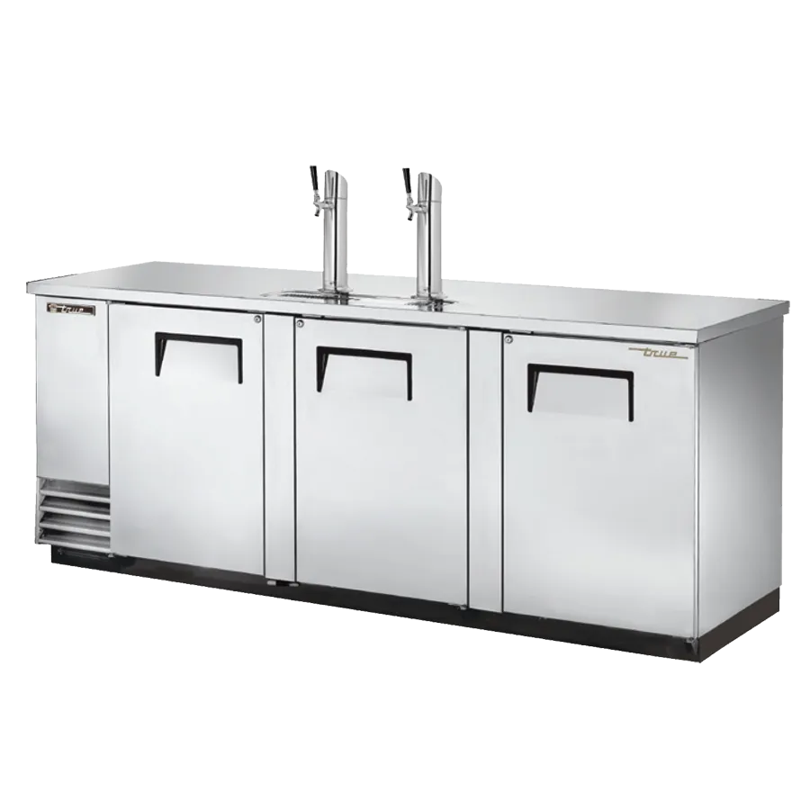 Cook with confidence and flair with the True Manufacturing TDD-4-S-HC Draft Beer Cooler. This commercial-grade cooler is perfect for restaurants looking to serve draft beer in style. With a capacity for four half kegs, this cooler ensures that you always have a variety of beers on tap to satisfy your customers' cravings. The stainless steel counter top provides a sleek and durable surface for pouring and serving drinks. The three solid hinged doors come with locks, allowing you to securely store your kegs and keep them fresh. The two insulated beer columns with a single faucet draft arm make it easy to pour the perfect pint every time. The stainless steel exterior and galvanized interior with a stainless steel floor not only look great but are also easy to clean and maintain. With its ENERGY STAR rating and use of R290 Hydrocarbon refrigerant, this cooler is not only efficient but also environmentally friendly. Trust True Manufacturing to deliver high-quality and reliable equipment for your restaurant.
