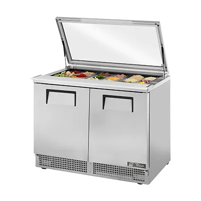 Cooking at its finest begins with the True Manufacturing TFP-48-18M-FGLID Refrigerated Counter, Mega Top Sandwich/Salad Unit. This two-section, self-contained unit is designed to meet the demands of a busy commercial restaurant. With its heavy-duty flat glass lid and 18 poly pans, you can easily store and display a variety of sandwiches and salads. The 8-inch deep, 1/2-inch thick cutting board provides ample space for food preparation, while the stainless steel front, top, and sides ensure durability and easy cleaning. The aluminum back and interior with a stainless steel floor add to its longevity. The rear-mounted refrigeration system keeps your ingredients fresh and ready for use. With four shelves and 2.5-inch castors, this unit offers convenient storage and mobility. Made in the USA and UL EPH Classified, the True Manufacturing TFP-48-18M-FGLID is a reliable and efficient addition to any commercial kitchen.