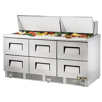 Fuel your passion for cooking with the True Manufacturing TFP-72-30M-D-6 Refrigerated Counter, Mega Top Sandwich/Salad Unit. This three-section, self-contained unit is designed to meet the demands of a busy commercial restaurant. It comes with (30) 1/6 size poly pans, allowing you to store a variety of ingredients for sandwiches and salads. The stainless steel insulated cover ensures that your ingredients stay fresh and at the perfect temperature. The unit also features an 8-inch thick cutting board, providing a convenient workspace for food preparation. With (6) drawers, each accommodating (1) 12" x 20" x 6"D pan and (3) 1/9 size or (6) 1/6 size and (3) 1/9 size pans, you'll have plenty of storage space. The aluminum interior with a stainless steel floor is easy to clean and maintain. With rear-mounted refrigeration and 2-1/2" castors, this unit is both efficient and mobile. Trust True Manufacturing for quality and durability. Made in the USA, this refrigerated counter is cULus and UL EPH Classified. Upgrade your restaurant's food preparation capabilities with the True Manufacturing TFP-72-30M-D-6 Refrigerated Counter, Mega Top Sandwich/Salad Unit.