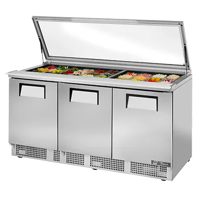 Discover kitchen perfection with the True Manufacturing TFP-72-30M-FGLID Refrigerated Counter, Mega Top Sandwich / Salad Unit. This three-section, self-contained unit is designed to meet the demands of a busy commercial restaurant. With its heavy-duty flat glass lid and 30 poly pans, you can easily store and display a variety of sandwiches and salads. The 8-inch deep, 1/2-inch thick cutting board provides ample space for food preparation, while the stainless steel front, top, and sides ensure durability and easy cleaning. The aluminum interior with a stainless steel floor is both hygienic and resistant to corrosion. The rear-mounted refrigeration system keeps your ingredients fresh and ready for service. With 6 shelves and 2.5-inch castors, this unit offers convenient storage and mobility. Made in the USA and UL EPH Classified, the True Manufacturing TFP-72-30M-FGLID is the perfect addition to any commercial kitchen, delivering reliability, efficiency, and performance.