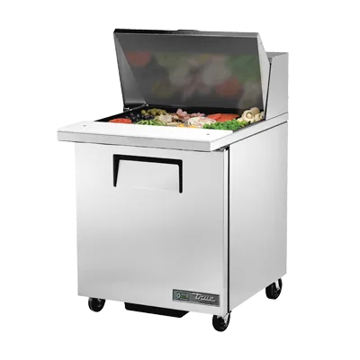 Master the art of flavor with the True Manufacturing TSSU-27-12M-C-HC Refrigerated Counter, Mega Top Sandwich/Salad Unit. This top-of-the-line unit is designed to meet the demands of a busy commercial restaurant, ensuring that your ingredients stay fresh and ready for use. With its stainless steel insulated cover and series stainless steel top, front, and sides, this unit is not only durable but also easy to clean. The unit features a spacious interior with (12) 1/6 size poly pans, allowing you to store a variety of ingredients for sandwiches and salads. The 8-7/8"D cutting board provides a convenient workspace for food preparation. Equipped with a door and two shelves, this unit offers ample storage space for your restaurant's needs. The aluminum interior with a stainless steel floor ensures optimal hygiene, while the 5" castors make it easy to move the unit around. With its energy-efficient design and R290 Hydrocarbon refrigerant, this unit is not only environmentally friendly but also cost-effective. Trust True Manufacturing to deliver high-quality refrigeration solutions for your commercial restaurant.