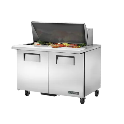 Take your kitchen to the next level with the True Manufacturing TSSU-48-18M-B-HC Refrigerated Counter, Mega Top Sandwich/Salad Unit. This top-of-the-line unit is designed to meet the demands of a busy commercial restaurant. With its mega top design, it can accommodate up to 18 1/6 size poly pans, allowing you to store and organize a variety of ingredients for sandwiches and salads. The stainless steel insulated cover ensures that your ingredients stay fresh and at the perfect temperature. The unit also features a spacious cutting board, stainless steel top, front, and sides, and an aluminum back for durability. With two full doors and four PVC coated wire shelves, you'll have plenty of storage space for all your ingredients. The aluminum interior with a stainless steel floor is easy to clean and maintain. Equipped with 5" castors, this unit is easy to move around your kitchen. Plus, it uses R290 Hydrocarbon refrigerant, making it energy-efficient and environmentally friendly. Upgrade your kitchen with the True Manufacturing TSSU-48-18M-B-HC Refrigerated Counter, Mega Top Sandwich/Salad Unit and experience the convenience and efficiency it brings to your restaurant.