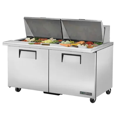 Enhance your commercial kitchen with the True Manufacturing TSSU-60-24M-B-ST-HC Refrigerated Counter, Mega Top Sandwich / Salad Unit. This top-of-the-line unit is designed to meet the demands of a busy restaurant kitchen. With its spacious interior and 24 poly pans, you'll have plenty of room to store and organize your ingredients. The stainless steel insulated covers ensure that your food stays fresh and at the perfect temperature. The 8-7/8" cutting board provides a convenient workspace for preparing sandwiches and salads. Made in the USA, this unit is built to last with its durable stainless steel top, front, and sides. The aluminum back and interior with a stainless steel floor make for easy cleaning and maintenance. Equipped with four shelves and two full doors, you'll have quick and easy access to all your ingredients. The 5" castors allow for easy mobility, making it effortless to clean around the unit. With its energy-efficient design and R290 Hydrocarbon refrigerant, this unit is not only good for your business but also for the environment. Invest in the True Manufacturing TSSU-60-24M-B-ST-HC Refrigerated Counter, Mega Top Sandwich / Salad Unit and take your commercial kitchen to the next level.