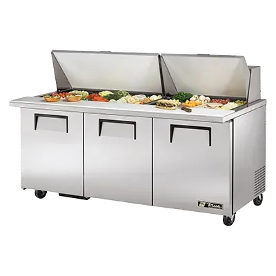 Elevate your dining experience with the True Manufacturing TSSU-72-30M-B-ST-HC Refrigerated Counter, Mega Top Sandwich/Salad Unit. This top-of-the-line unit is designed to meet the demands of a busy commercial restaurant. With its spacious interior, you can store and organize all your sandwich and salad ingredients effortlessly. The unit comes with (30) 1/6 size poly pans, each with a 4-inch depth, allowing you to keep a wide variety of toppings and fillings at the perfect temperature. The stainless steel insulated covers ensure maximum freshness and hygiene. The 8-7/8-inch cutting board provides a convenient workspace for food preparation. Made in the USA, this unit features a durable stainless steel top, front, and sides, as well as an aluminum back for long-lasting performance. The aluminum interior with a stainless steel floor is easy to clean and maintain. Equipped with three full doors and six shelves, this unit offers ample storage space. The 5-inch castors make it easy to move the unit for cleaning or rearranging. With its energy-efficient design and R290 Hydrocarbon refrigerant, this unit not only saves on energy costs but also reduces environmental impact. Trust True Manufacturing to deliver exceptional quality and reliability for your commercial restaurant needs.