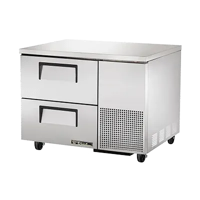Cook with confidence with the True Manufacturing TUC-44D-2-HC Refrigerator. This undercounter reach-in refrigerator is designed to meet the demands of a commercial restaurant kitchen. With its stainless steel top and sides, it not only looks sleek but also ensures durability and easy cleaning. The refrigerator features two drawers, each capable of accommodating two 12" x 20" x 8" pans (pans not included), providing ample storage space for your ingredients. The aluminum interior with a stainless steel floor further enhances its durability and hygiene. Equipped with 5" castors, this refrigerator is easy to move and position wherever you need it. The side mount design allows for easy access to the drawers, making it convenient for busy kitchen environments. With its R290 Hydrocarbon refrigerant and 1/10 HP compressor, this refrigerator is energy-efficient and environmentally friendly. Trust True Manufacturing for a reliable and efficient refrigeration solution for your commercial kitchen.