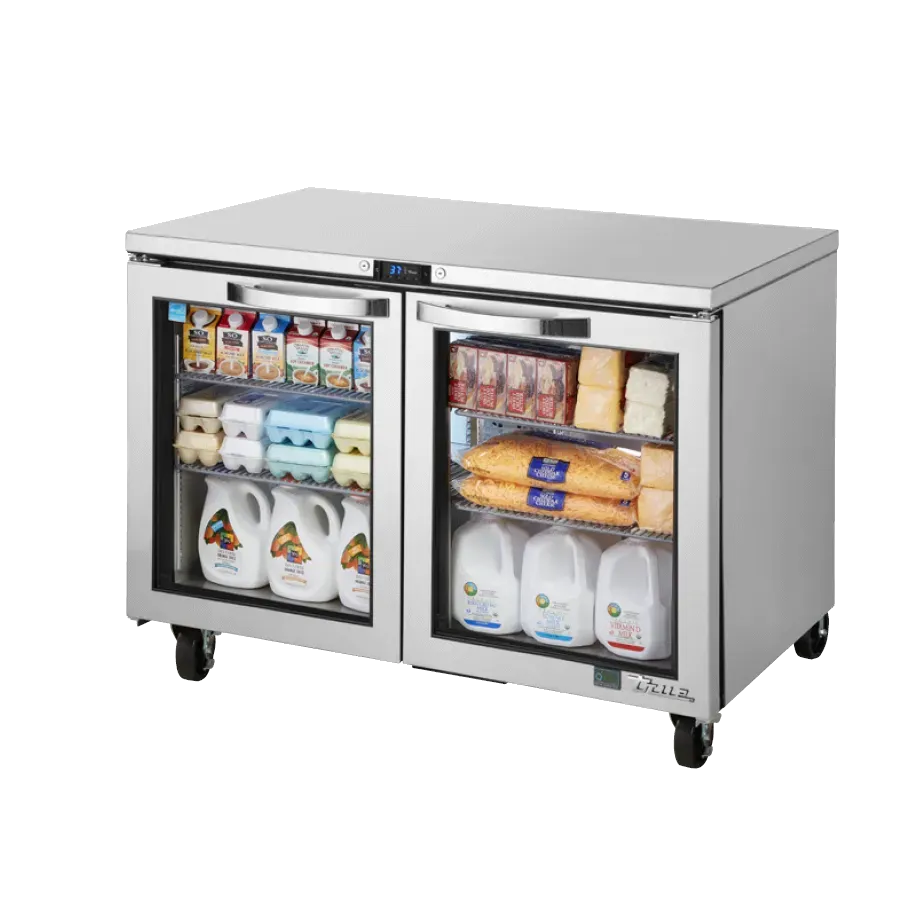 Achieve culinary excellence with the True Manufacturing TUC-48G-HC~SPEC3 Undercounter Refrigerator. This top-of-the-line refrigerator is designed to meet the demanding needs of commercial restaurants. With its SPEC Package 3, it offers a range of features that ensure optimal performance and convenience. The 16-gauge stainless steel top, sides, and back provide durability and a sleek appearance, while the stainless steel interior is easy to clean and maintain. The two Low-E glass doors not only enhance visibility but also come with steel handles and a door lock for added security. Inside, you'll find four shelves that offer ample storage space for your ingredients and products. The electronic temperature control with a digital display allows you to easily monitor and adjust the temperature between 33 and 38 degrees Fahrenheit. With its 5" castors, this refrigerator is easy to move and position wherever you need it. Made in the USA and featuring R290 Hydrocarbon refrigerant, this True Manufacturing undercounter refrigerator is not only reliable but also environmentally friendly. Elevate your restaurant's efficiency and organization with the True Manufacturing TUC-48G-HC~SPEC3 Undercounter Refrigerator.