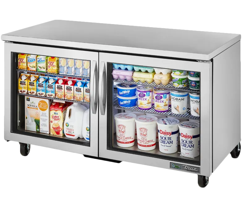 Craft culinary wonders with the True Manufacturing TUC-60G-HC~FGD01 Refrigerator. This undercounter reach-in refrigerator is designed to meet the demands of a commercial restaurant setting. With its stainless steel top and sides, it not only looks sleek but also ensures durability and easy cleaning. The framed glass doors, made with Low-E glass, provide a clear view of the contents while maintaining energy efficiency. Inside, you'll find four shelves and an aluminum interior with a stainless steel floor, offering ample storage space and easy maintenance. The 5" castors make it easy to move the refrigerator for cleaning or rearranging. Powered by a 1/4 HP compressor and using R290 Hydrocarbon refrigerant, this unit is energy-efficient and environmentally friendly. With its cULus and UL EPH Classified certifications, you can trust in its quality and safety. Elevate your culinary creations with the True Manufacturing TUC-60G-HC~FGD01 Refrigerator.