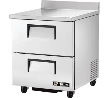 Unleash your inner chef with the True Manufacturing TWT-27D-2-HC Refrigerated Counter. This work top refrigerator is perfect for commercial restaurant use, offering a convenient and efficient way to store and prepare ingredients. With its stainless steel top and rear splash, this one-section unit is not only durable but also easy to clean. The two drawers can each accommodate a 12" x 20" x 6" pan, allowing for organized storage and easy access to ingredients. The clear coated aluminum interior with a stainless steel floor ensures optimal hygiene and durability. Equipped with 5" castors and rear mount, this refrigerator is easy to move and position in your kitchen. The TWT-27D-2-HC uses R290 Hydrocarbon refrigerant, which is not only environmentally friendly but also energy-efficient. With a 1/6 HP compressor, this unit provides reliable cooling while consuming minimal energy. Made in the USA and certified by cULus, UL EPH Classified, and CE, you can trust the quality and safety of this True Manufacturing Refrigerated Counter. Upgrade your kitchen with the TWT-27D-2-HC and experience the convenience and efficiency it brings to your culinary endeavors.
