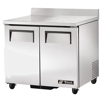 Unleash your kitchen's potential with the True Manufacturing TWT-36-HC Refrigerated Counter. This two-section work top refrigerator is designed to meet the demands of a busy commercial restaurant. With its stainless steel top and rear splash, it provides a durable and easy-to-clean surface for food preparation. The two stainless steel doors and four shelves offer ample storage space for ingredients and prepared dishes. The aluminum interior with a stainless steel floor ensures optimal temperature retention and hygiene. Equipped with 5" castors, this refrigerator is easy to move and position wherever it's needed. The TWT-36-HC uses R290 Hydrocarbon refrigerant, which is not only environmentally friendly but also helps to reduce energy consumption. Made in the USA and certified by cULus and UL EPH Classified, this True Manufacturing Refrigerated Counter is a reliable and efficient addition to any commercial kitchen.