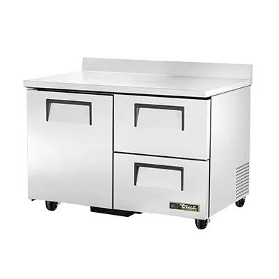 Unleash your inner chef with the True Manufacturing TWT-48D-2-HC Refrigerated Counter. This two-section work top refrigerator is designed to meet the demands of a busy commercial restaurant. With its stainless steel top and rear splash, it not only provides a durable and easy-to-clean surface but also adds a touch of elegance to your kitchen. The unit features one stainless steel door and two shelves, along with two drawers that can accommodate a 12" x 18" x 6" pan (not included). The aluminum interior with a stainless steel floor ensures optimal temperature retention and hygiene. Equipped with 5" castors and a rear mount, this refrigerator is easy to move and position. Powered by a 1/5 HP compressor and using R290 Hydrocarbon refrigerant, it delivers efficient cooling while being environmentally friendly. Made in the USA, this True Manufacturing Refrigerated Counter is a reliable and high-quality addition to any commercial kitchen.