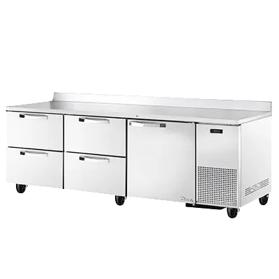 Achieve kitchen supremacy with the True Manufacturing TWT-93D-4-HC~SPEC3 Refrigerated Counter Work Top. This three-section work top refrigerator is designed to meet the demands of a busy commercial restaurant kitchen. With its 16-gauge stainless steel top and rear splash, stainless steel front, sides, and back, and stainless steel interior, this unit is built to withstand the rigors of a professional kitchen. The heavy-duty stainless steel door comes with a lock for added security, and the two shelves and four drawers provide ample storage space for ingredients and supplies. The refrigerator can accommodate two 12" x 20" x 8" pans (not included), making it perfect for storing prepped ingredients. The electronic temperature control with a digital display ensures precise temperature management, while the 5" castors allow for easy mobility. Made in the USA, this True Manufacturing work top refrigerator is UL EPH Classified and cULus listed, guaranteeing its quality and reliability. Upgrade your kitchen with the TWT-93D-4-HC~SPEC3 and experience the difference in performance and durability.