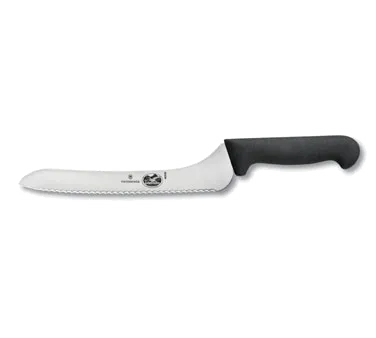 Streamline Your Culinary Workflow with the Victorinox Swiss Army, 7.6058.13 Bread / Sandwich Knife. This high-quality knife is designed to enhance efficiency in commercial restaurant kitchens. With its 9" offset blade and wavy edge, it effortlessly slices through bread and sandwiches, ensuring consistent and precise cuts every time. The black Fibrox handle provides a comfortable grip, reducing fatigue during long hours of use. Made from high carbon stainless steel, this knife offers exceptional durability and resistance to corrosion, making it perfect for the demanding environment of a busy restaurant kitchen. Trust Victorinox Swiss Army, a renowned vendor in the industry, to deliver a reliable and authentic product that will elevate your culinary creations and impress your customers.