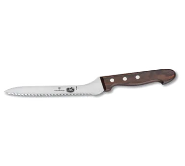 Equip Your Kitchen for Culinary Perfection with the Victorinox Swiss Army, 7.6058.15, Knife, Bread / Sandwich. This high-quality knife is a must-have for any commercial restaurant. With its 7-1/2" blade and offset design, it allows for precise and effortless slicing of bread and sandwiches. The 1-1/8" width at the handle provides a comfortable grip, ensuring safety and control during use. The rosewood handle adds a touch of elegance to this durable and reliable knife. Designed by Victorinox Swiss Army, a trusted name in kitchen cutlery, this knife is built to withstand the demands of a busy restaurant kitchen. Whether you're slicing through crusty baguettes or creating perfectly layered sandwiches, this knife will deliver exceptional results every time. Invest in the Victorinox Swiss Army, 7.6058.15, Knife, Bread / Sandwich and elevate your culinary creations to new heights.