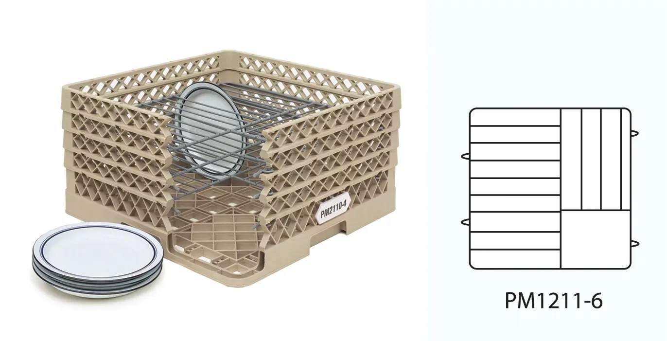 Achieve culinary excellence with the Vollrath PM1211-6 Dishwasher Rack for Plates. This high-quality rack is designed to meet the demands of a busy commercial restaurant kitchen. With its 10-3/4" to 11-3/16" diameter capacity, it can accommodate a variety of plate sizes, making it versatile for any dish. The rack features six extenders with wire dividers, allowing for maximum plate height of 1-3/4". This ensures that your plates are securely held in place during the washing process. Made from durable co-polymer plastic, this rack is built to withstand the rigors of a commercial dishwasher. The snap-fit extenders and stackable design make it easy to store and organize multiple racks. Additionally, the open profile allows for thorough cleaning and drying. NSF certified and made in the USA, the Vollrath PM1211-6 Dishwasher Rack is a reliable and efficient solution for your restaurant's plate washing needs.