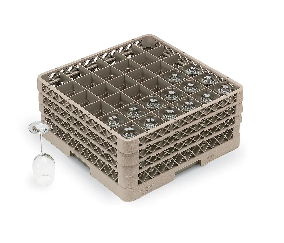 The strength of the Traex full-size glass rack by Vollrath is unmatched. Made of copolymer plastic to ensure chemical, impact and heat resistance up to 180°F for 30 minutes, this full-size rack is impressively durable. The open profile allows top-to-bottom and side-to-side washing, as well as air circulation for superior cleaning and drying, while the built-in rack dividers provide 100 percent vertical protection for your glassware. Compartments maximize space, reducing the number of loads required to wash all your glassware, and the three extenders create ample room for tall glasses. Handles on all four sides of the rack ensure easy gripping and transportation, while reinforced index strips allow for four-way tracking.
