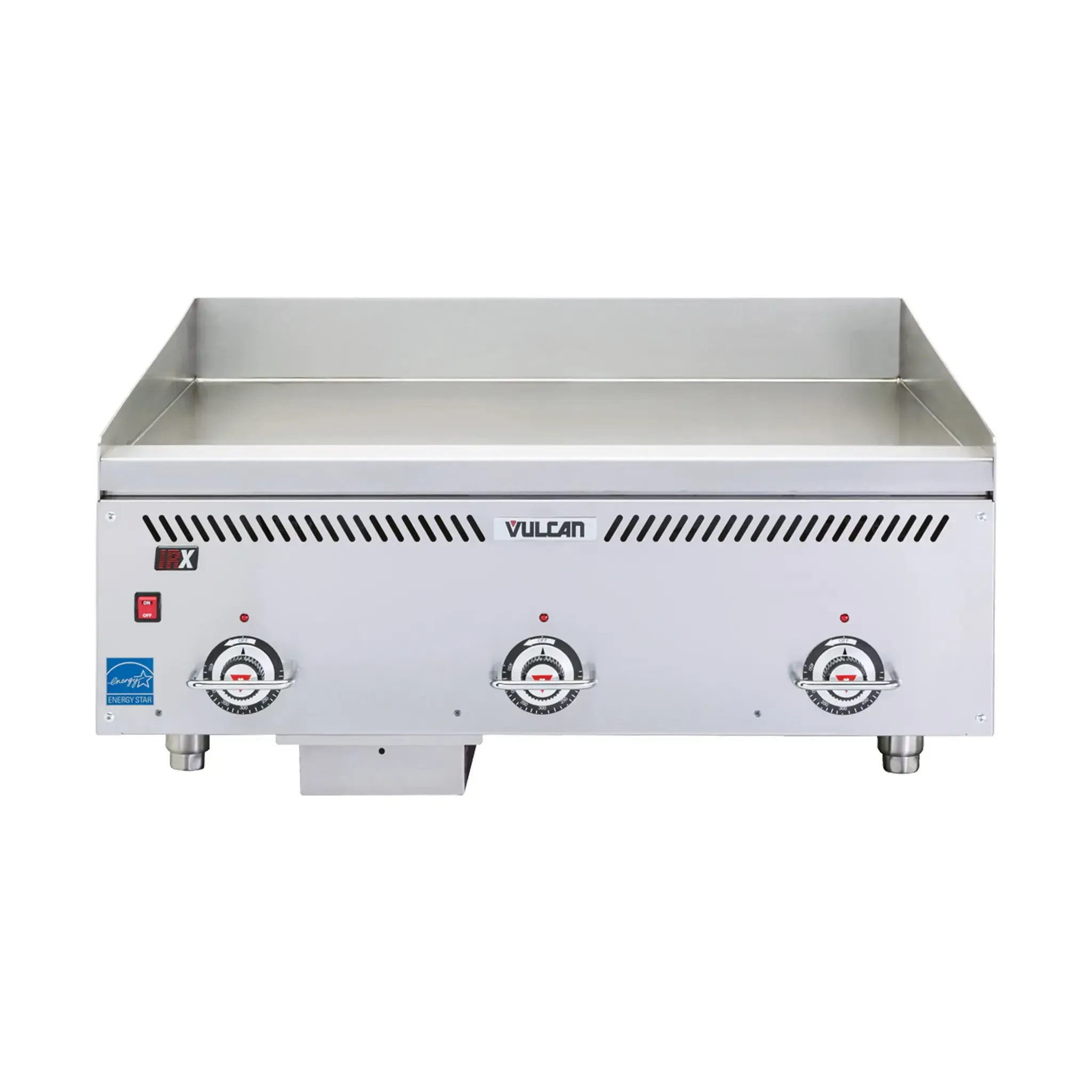 Unleash gastronomic brilliance with the Vulcan VCCG60-IC Gas Countertop Griddle. This heavy-duty griddle is designed to meet the demands of a commercial restaurant kitchen. With a spacious 60" W x 24" D cooking surface and a 3/4" thick Rapid Recovery composite plate, this griddle provides even heat distribution and quick temperature recovery. The griddle features five burners and solid state thermostats every 12 inches, allowing for precise temperature control. The innovative IRX infrared burner technology ensures efficient and consistent cooking results. The electronic spark ignition and pilot protection provide added safety and convenience. The griddle also comes with wire knob guards and two drawers for easy storage. Made with stainless steel front, sides, and front top ledge, this griddle is durable and easy to clean. The front grease trough and back and tapered side splashes help to contain messes. With 120,000 BTU of power, this griddle is NSF and CSA certified, making it a reliable and efficient choice for any commercial kitchen.