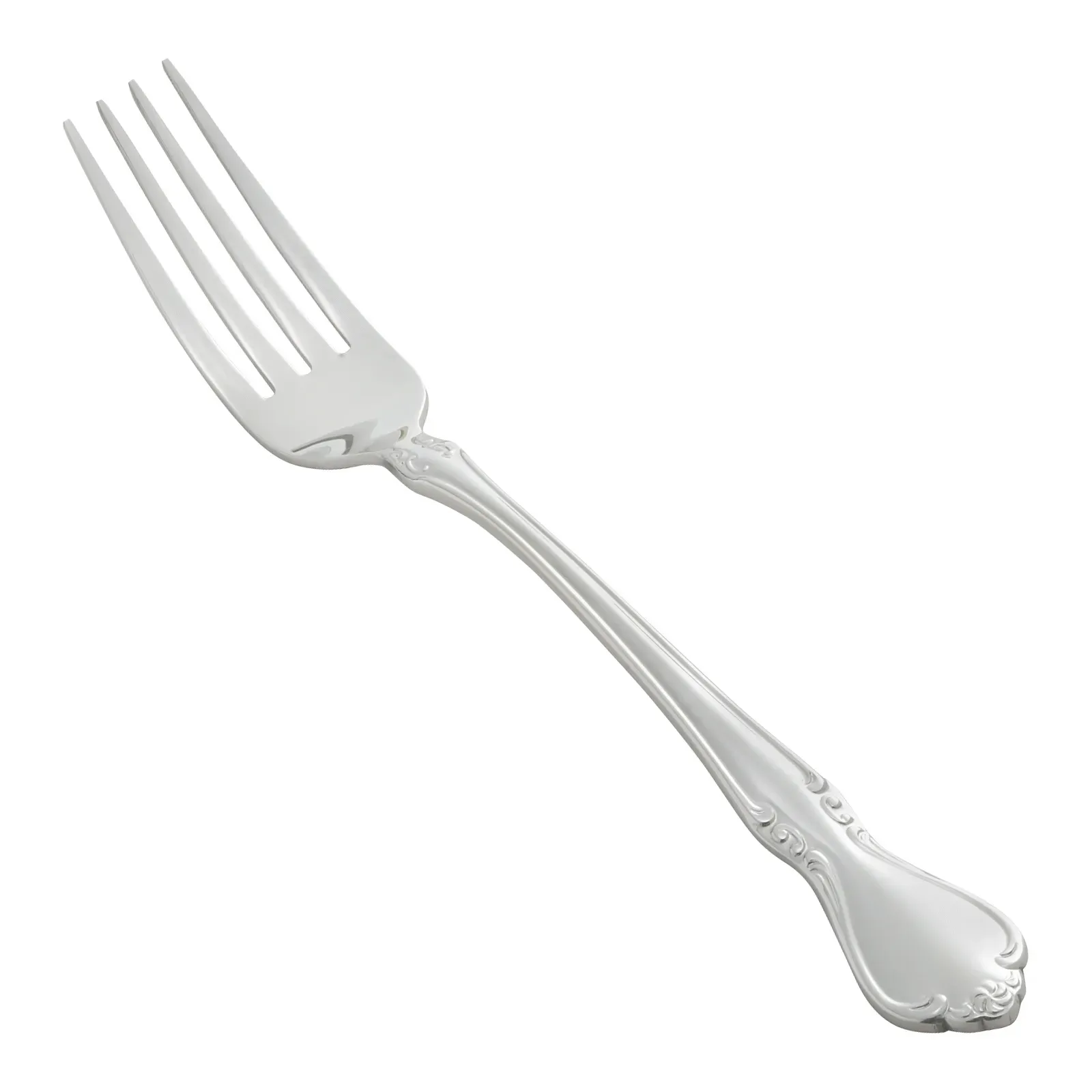 Elevate culinary creations with the European Table Fork by Winco. Crafted from 8-18.188 stainless steel, this extra heavy weight fork is designed to withstand the rigors of a bustling restaurant environment while maintaining an elegant appearance. The mirror finish of the Chantelle pattern adds a touch of sophistication to any table setting, making it an ideal choice for fine dining establishments.