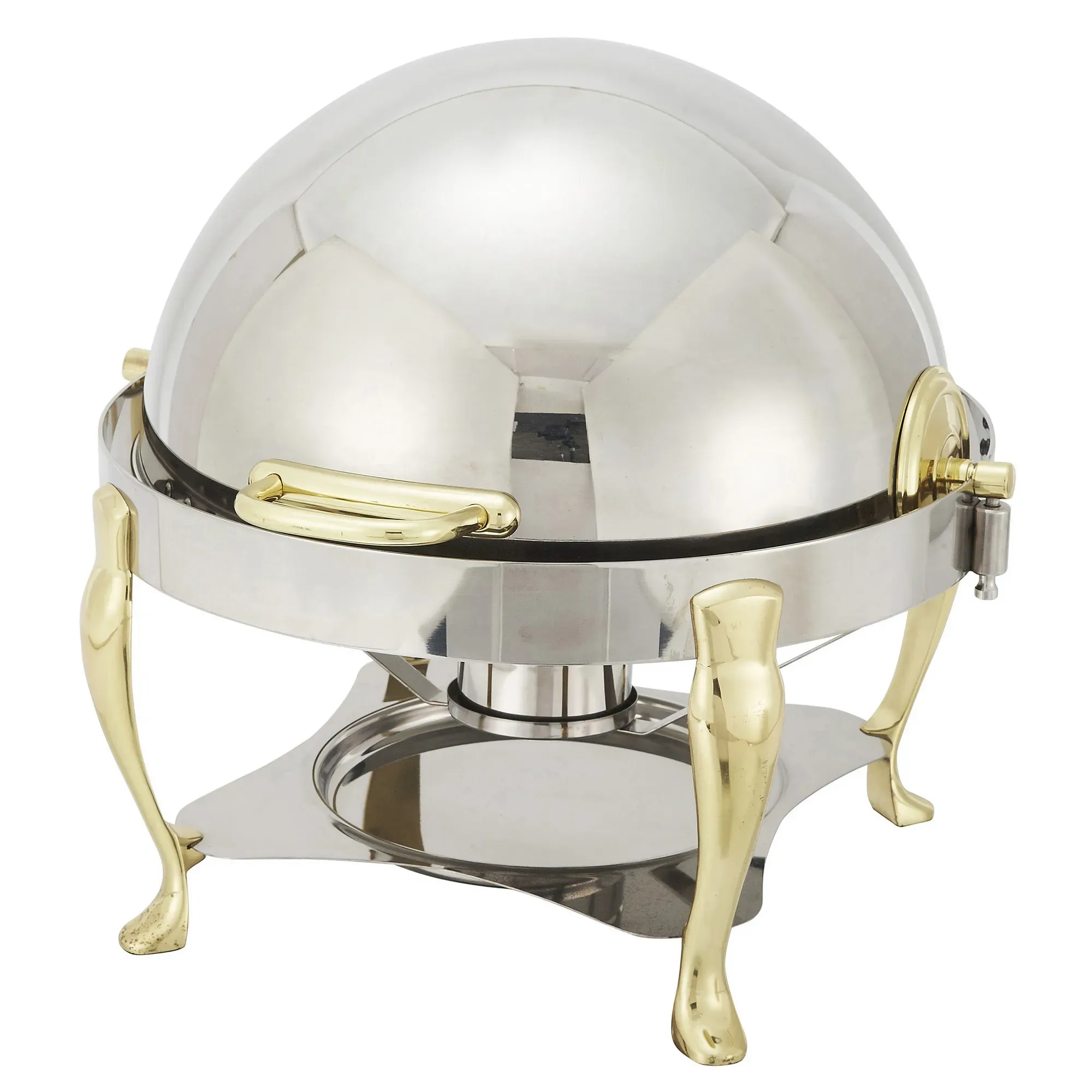 Elevate service with the Vintage Chafer from Winco, a stunning addition to any restaurant setting. This 6 qt. round chafer is crafted from 1810 stainless steel, ensuring durability and a sleek, professional appearance. The solid brass gold-plated handles and legs add a touch of elegance, making it a perfect centerpiece for your buffet or catering event.