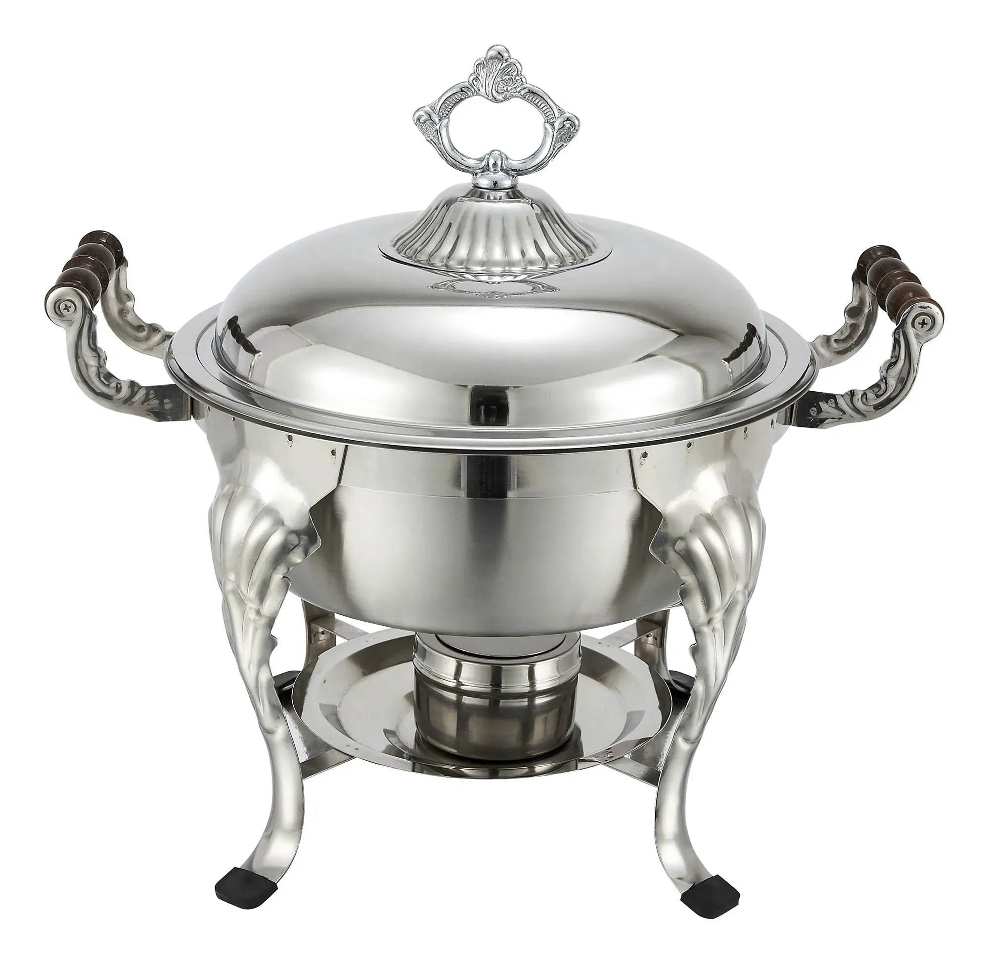 Bring efficiency and style to the kitchen with the Crown Chafer 6 qt. from Winco. This elegant chafer is designed to meet the high standards of any restaurant setting, ensuring both functionality and aesthetic appeal. Crafted from premium stainless steel, the Crown Chafer boasts a mirror finish that adds a touch of sophistication to your buffet or serving station. The Crown Chafer 6 qt. features a round dome cover that not only enhances its visual appeal but also helps retain heat, keeping your dishes warm and appetizing. The wooden handles provide a comfortable grip and add a rustic charm, making it easy to transport and handle even when hot. Included with the Crown Chafer are a food pan, water pan, and fuel holder, ensuring you have everything you need to keep your dishes at the perfect serving temperature. The 6 qt. capacity is ideal for serving a variety of dishes, from savory entrees to delectable desserts, making it a versatile addition to your kitchen equipment. The model 708 is specifically designed to offer durability and reliability, essential for the fast-paced environment of a restaurant. Its robust construction ensures it can withstand frequent use while maintaining its pristine appearance. Elevate your dining experience with the Crown Chafer 6 qt. from Winco, where quality meets elegance, ensuring your guests enjoy every meal in style.