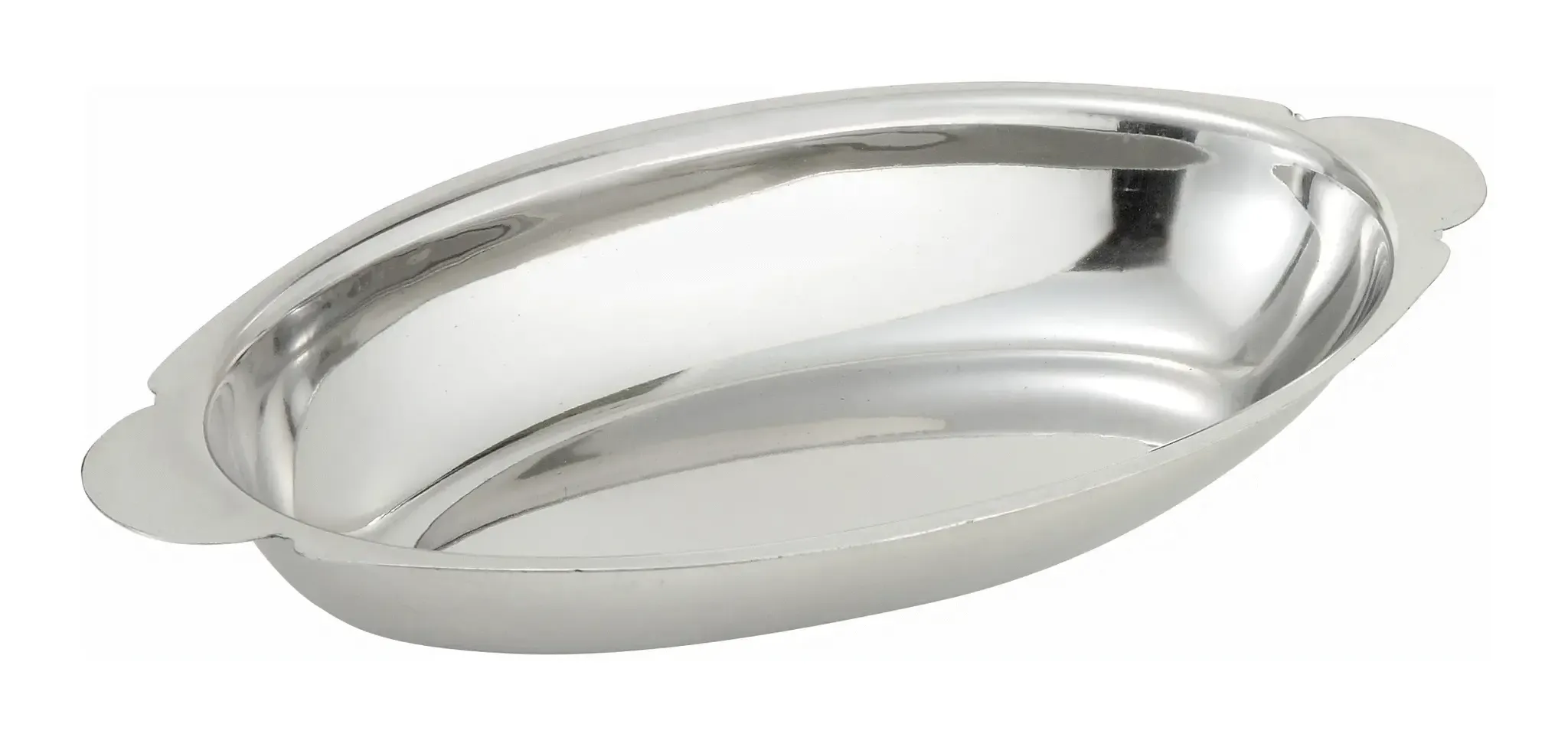 Crafted for the discerning chef with an eye for both functionality and elegance, the Winco Au Gratin Dish is an essential addition to any restaurant's kitchen arsenal. This 20 oz. oval stainless steel dish, model ADO-20, is designed to deliver exceptional performance and presentation for your au gratin recipes.