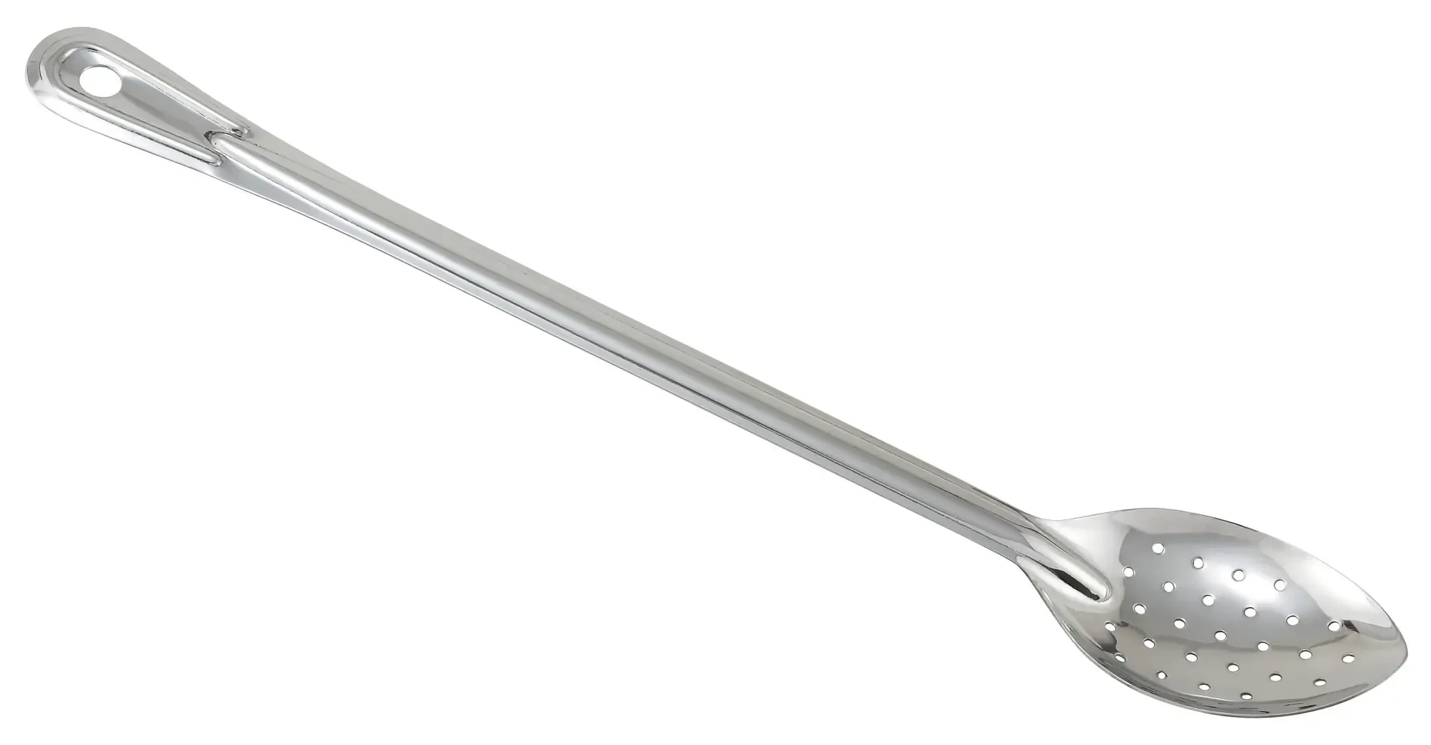 The perforated design of the Winco Basting Spoon allows for efficient draining of liquids, making it perfect for basting meats, serving vegetables, or skimming broths. Its long handle provides a comfortable grip and keeps your hands safely away from heat, ensuring both safety and ease of use during busy service hours.