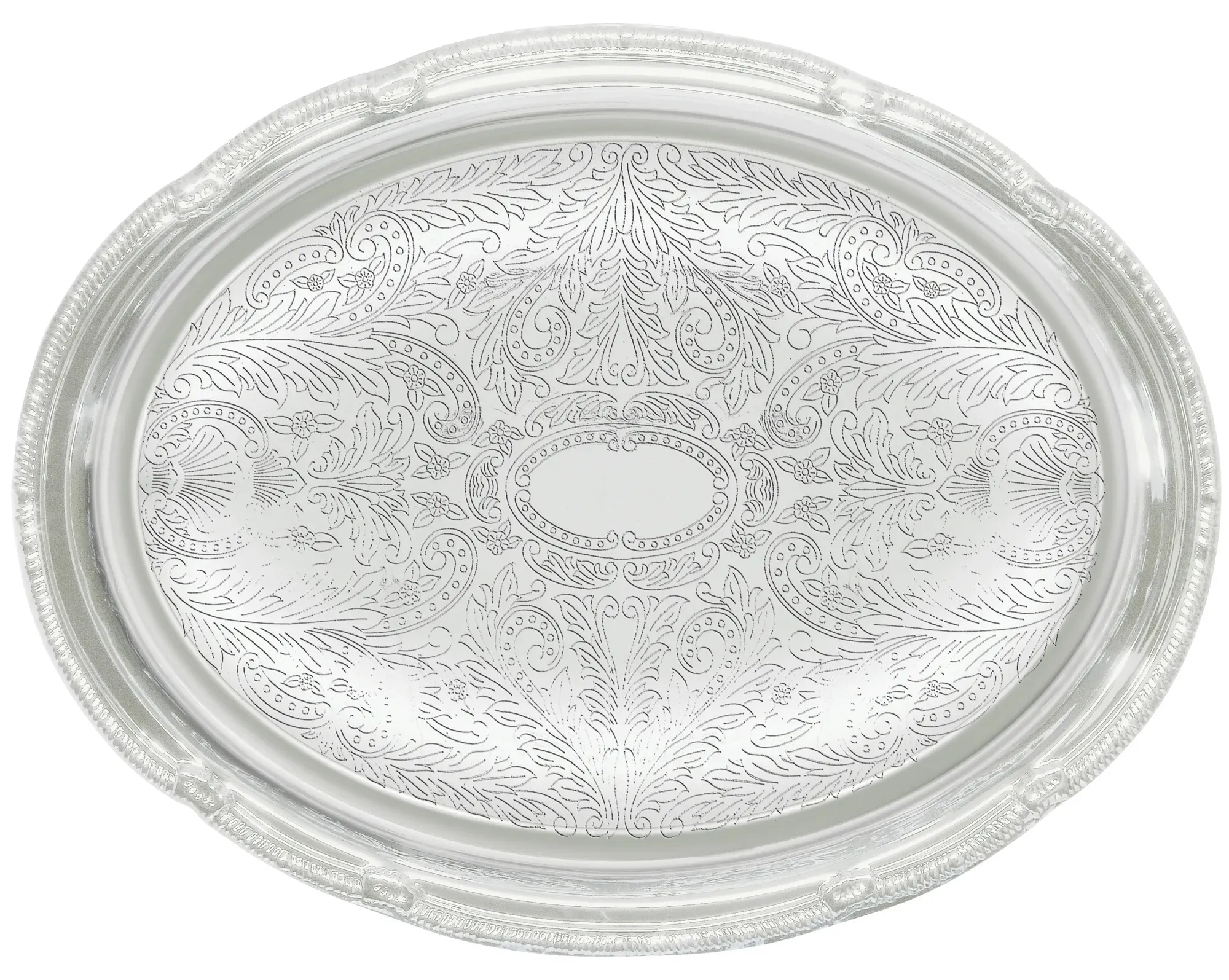 Crafted with a 14-3/4 x 10-1/2 oval shape, the Winco Serving Tray offers ample space for serving a variety of dishes, from appetizers to desserts. The gadroon edge adds a touch of classic elegance, making it a perfect fit for upscale dining environments. The traditional engraving on the tray enhances its visual appeal, ensuring that it complements any table setting beautifully.